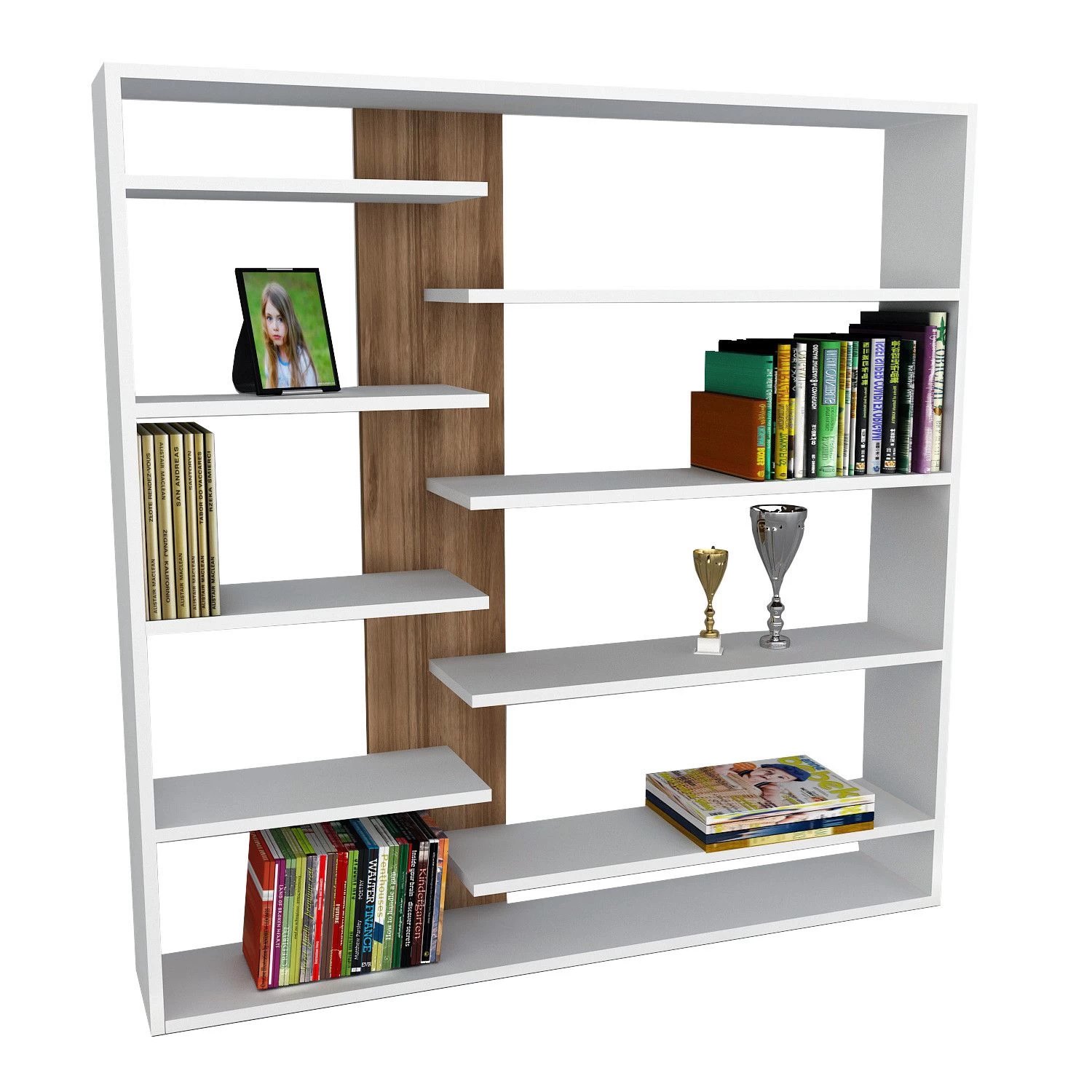 Wooden Art Bookshelf is een stijlvolle en duurzame opbergoplossing met een 100% melamine gecoate spaanplaat constructie. Het heeft een dikte van 18mm en afmetingen van 125cm (B) x 126cm (H) x 22cm (D). De rechter plank heeft een breedte van 77cm en is afgewerkt in een mooie witte walnootkleur.
