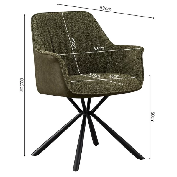 De ‘Lucie’ stoel in Bouclé Groen met PU rug en polyester bekleding is een prachtige mix van stijl, comfort en duurzaamheid. Deze stoel is gemaakt met metalen poten en biedt stevige en betrouwbare ondersteuning. De bekleding is gemaakt van een combinatie van 100% polyester en PU, wat zorgt voor een zacht en glad gevoel. Met een hoogte van 82,5 cm, breedte van 62 cm en diepte van 63 cm biedt hij de perfecte afmetingen voor elke ruimte. De belangrijkste kenmerken van de ‘Lucie’ stoel zijn het elegante ontwerp en de uitzonderlijke bouwkwaliteit. De PU groene rug voegt een vleugje verfijning toe, waardoor het een prachtige aanvulling is op elke kamerinrichting. De groene kleur straalt een gevoel van rust uit en creëert een kalmerende sfeer. De voordelen van de ‘Lucie’ stoel zijn talrijk. De metalen poten zorgen voor ongeëvenaarde stabiliteit, waardoor jij en je gasten veilig kunnen zitten. De bekleding van 100% polyester en PU is duurzaam, waardoor de stoel bestand is tegen slijtage. De compacte afmetingen van de stoel maken hem perfect voor kleine appartementen of kamers met beperkte ruimte. Bovendien maakt het stijlvolle ontwerp de algehele esthetiek van je huis of kantoor compleet. Of je nu een comfortabele stoel nodig hebt voor je woonkamer, slaapkamer of kantoor, de ‘Lucie’ stoel in Bouclé Green Back PU Greeb is de perfecte keuze.
