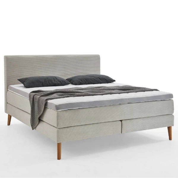 Boxspringbed Sirocco 212x142x116cm met houten pootjes en bekleding in beige ribfluweel. Voorzien van een pocketveringmatras van 140x200cm.Â