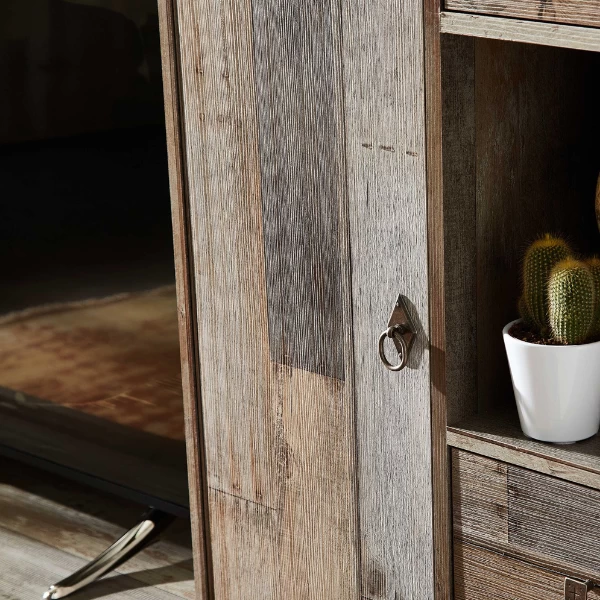 Buffetkast Clem 99x39x133cm uit spaanplaat met driftwood-look. Met drie deuren waarvan één opklapdeur, en drie lades.Â