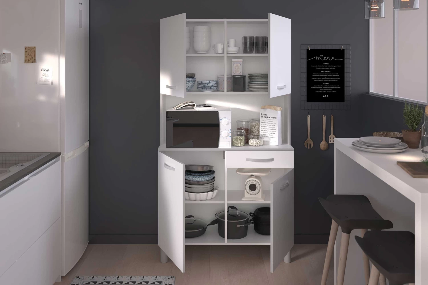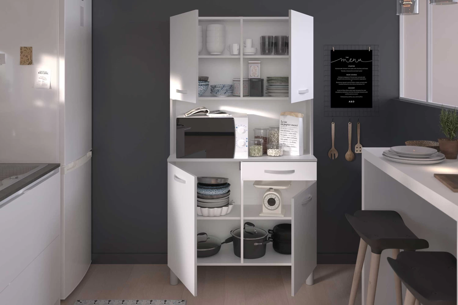 Buffetkast Easy vormt het antwoord op jouw opbergproblemen in de keuken. Deze ruime kast beschikt over heel veel opbergruimte dankzij de vier deuren en één lade. De compartimenten achter de deuren zijn voorzien van vier legplanken. Daarnaast is deze buffetkast uitgerust met één open opbergvak in het midden. De volledige kast is gemaakt uit spaanplaat met een witgelakte afwerking.