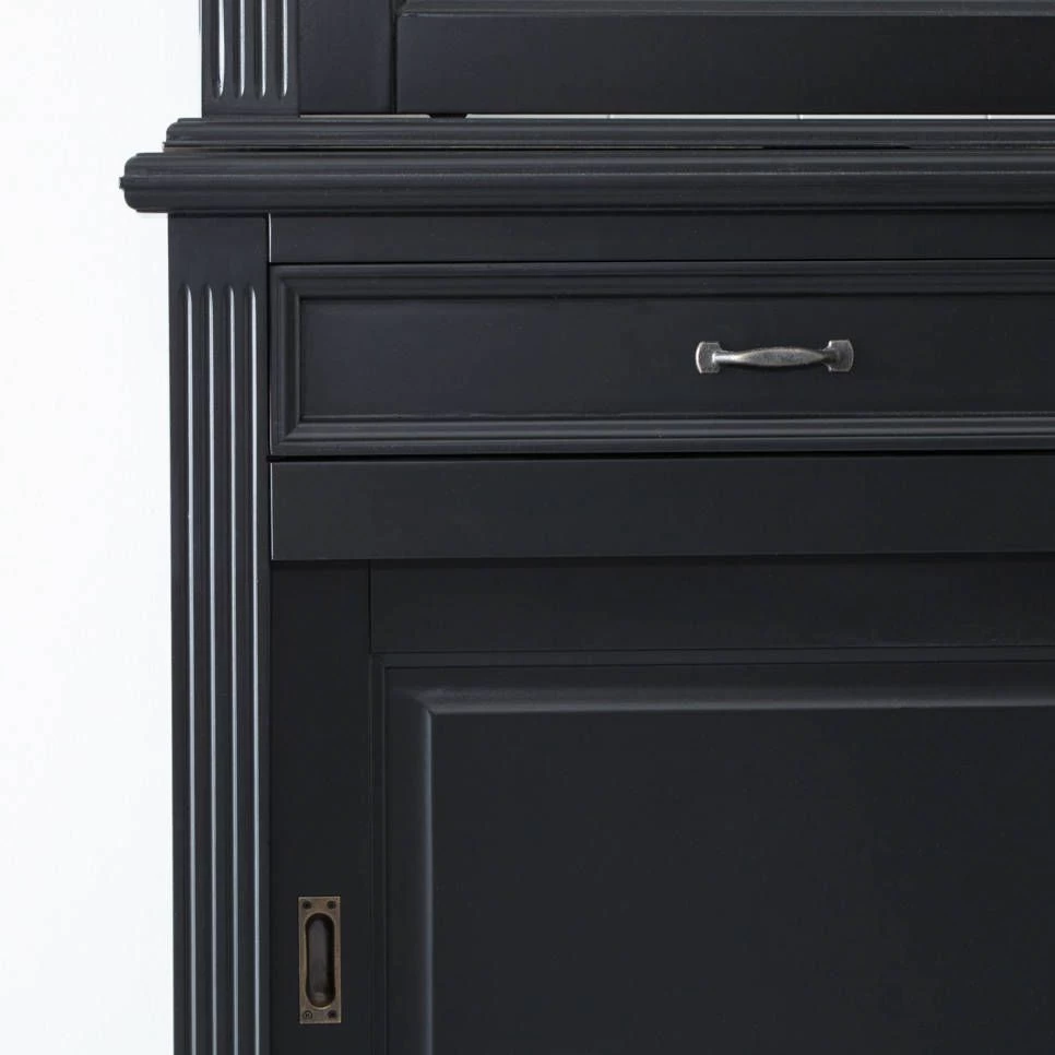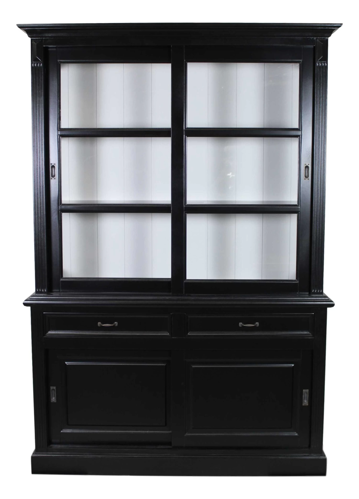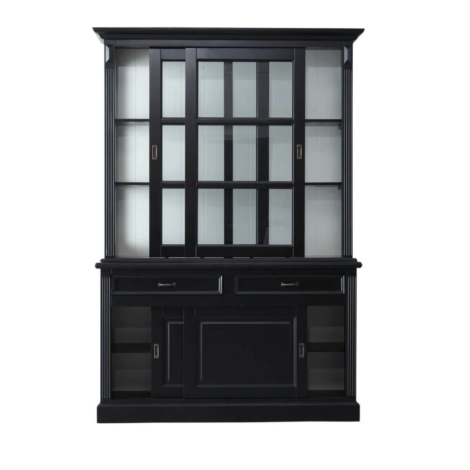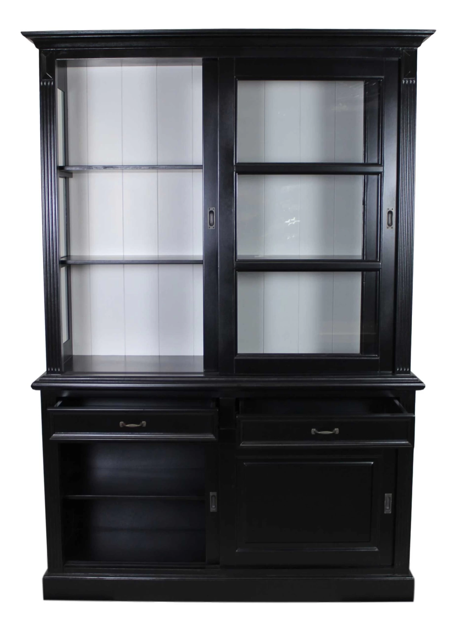 Buffetkast Provence in zwart met witte binnenkant, uitgerust met 2 glazen en 2 houten schuifdeuren, en in het midden 2 lades.Â