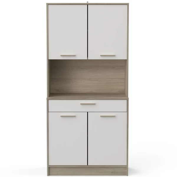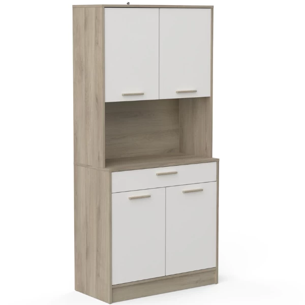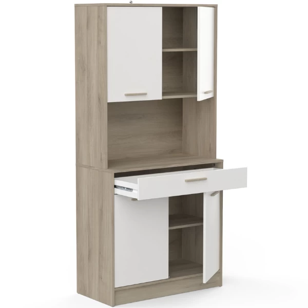 De combinatie van het strakke mat wit en het lichte kronberg eikdecor van buffetkast Romanie is een echte voltreffer. Deze kast beschikt over een lade voor uw bestek en 4 draaideuren met daarachter 2 legplanken voor allerhande keukengerei, kruiden, etc. In het open vak is er plaats voor eventueel een microgolfoven of andere keukenapparaten. Deze kast kan tegen de muur gemonteerd worden, de schroeven en pluggen hiervoor dient u zelf te voorzien.Â