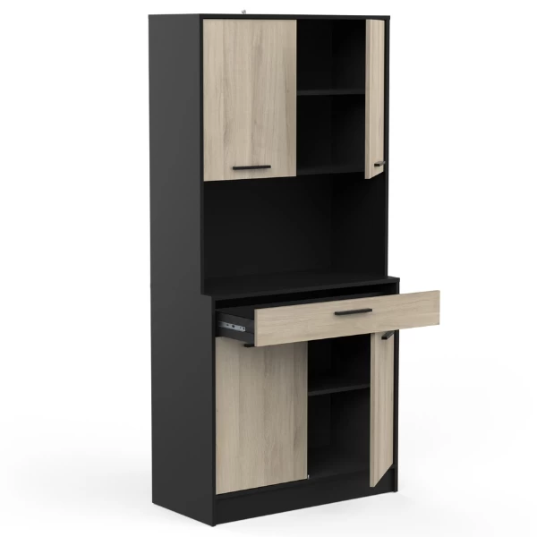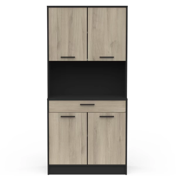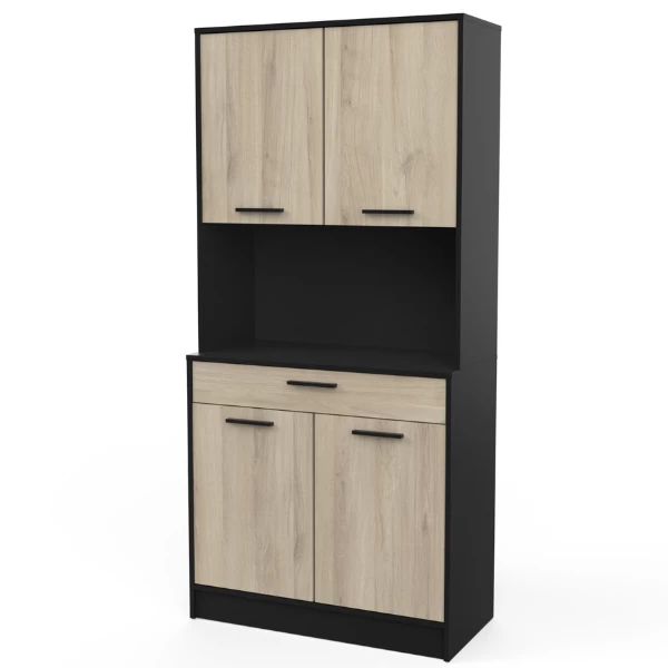 De combinatie van het strakke matzwart en het lichte kronberg eikdecor van buffetkast Romanie is een echte voltreffer. Deze kast beschikt over een lade voor uw bestek en 4 draaideuren met daarachter 2 legplanken voor allerhande keukengerei, kruiden, etc. In het open vak is er plaats voor eventueel een microgolfoven of andere keukenapparaten. Deze kast kan tegen de muur gemonteerd worden, de schroeven en pluggen hiervoor dient u zelf te voorzien.Â