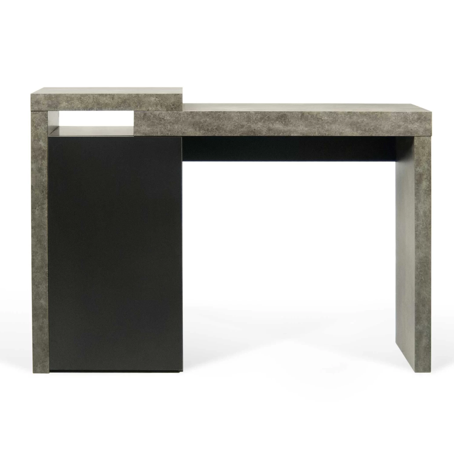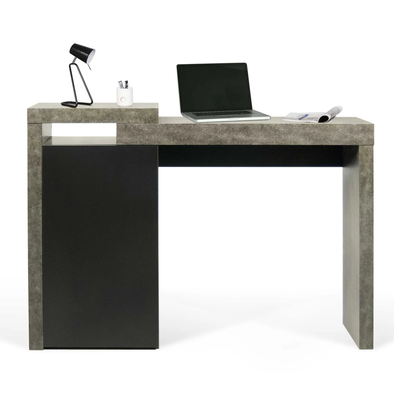 Dit multifunctionele meubel met modern design kan je als bureau of als sidetable gebruiken. Het blad met betonlook bestaat uit 2 niveaus met daartussen een open vakje waarin je kleine spullen kunt bewaren die je graag binnen handbereik hebt. Het zwarte kastje onderaan heeft 1 deur en is uitgerust met 2 opbergvakken binnenin. Het meubel is gemaakt van stevig honingraatpaneel en het blad is afgewerkt met een laagje melamine.