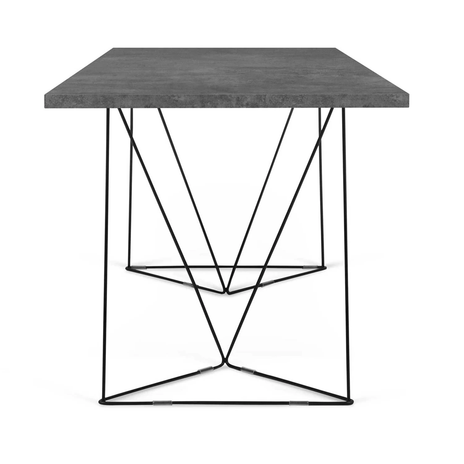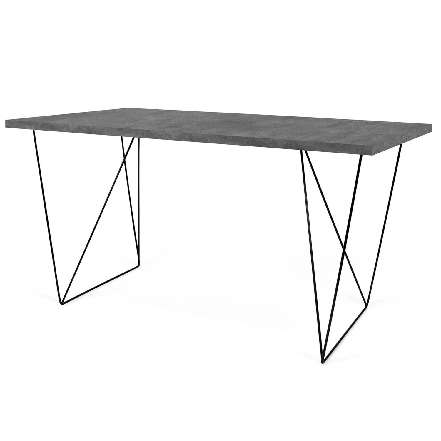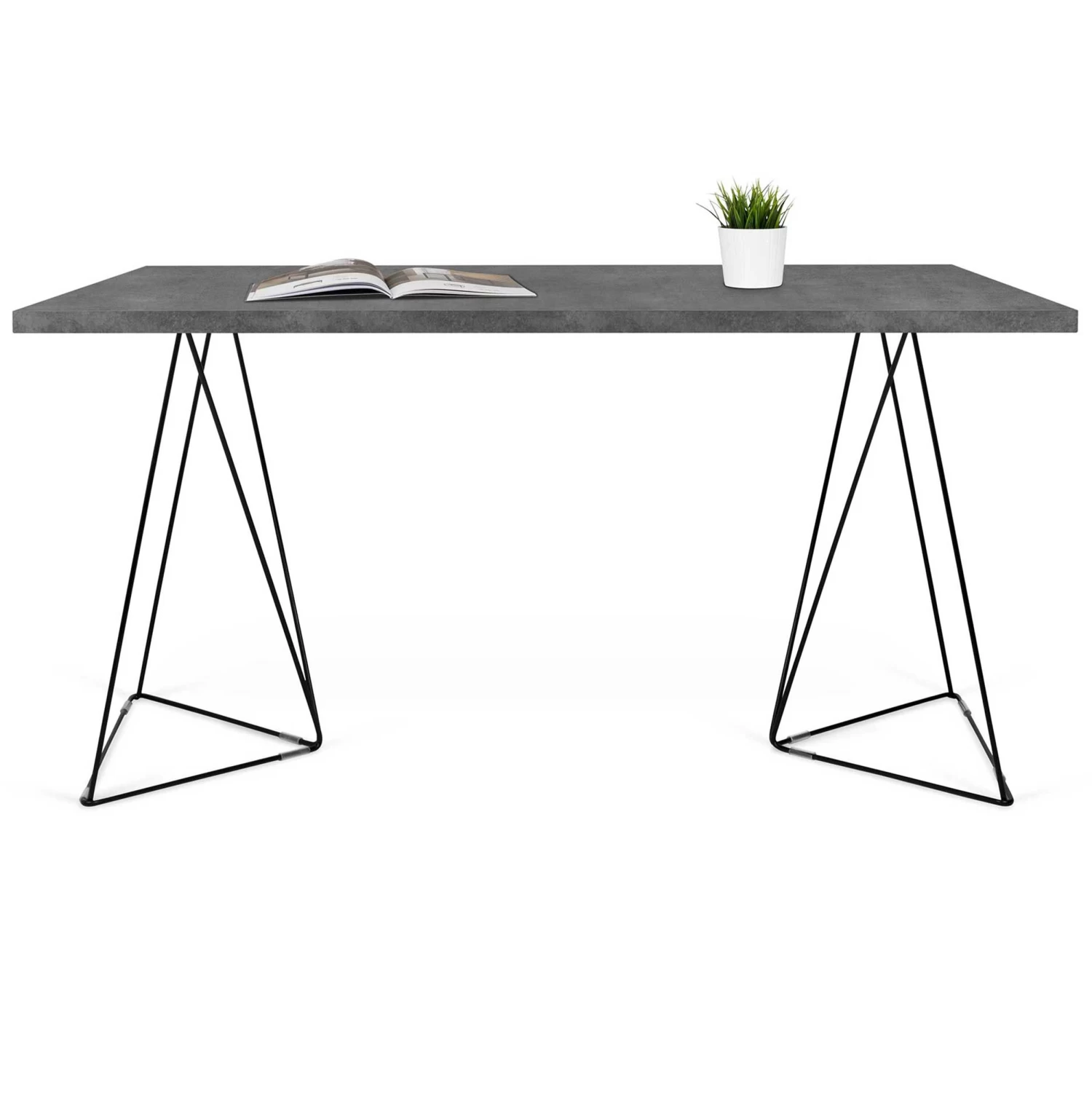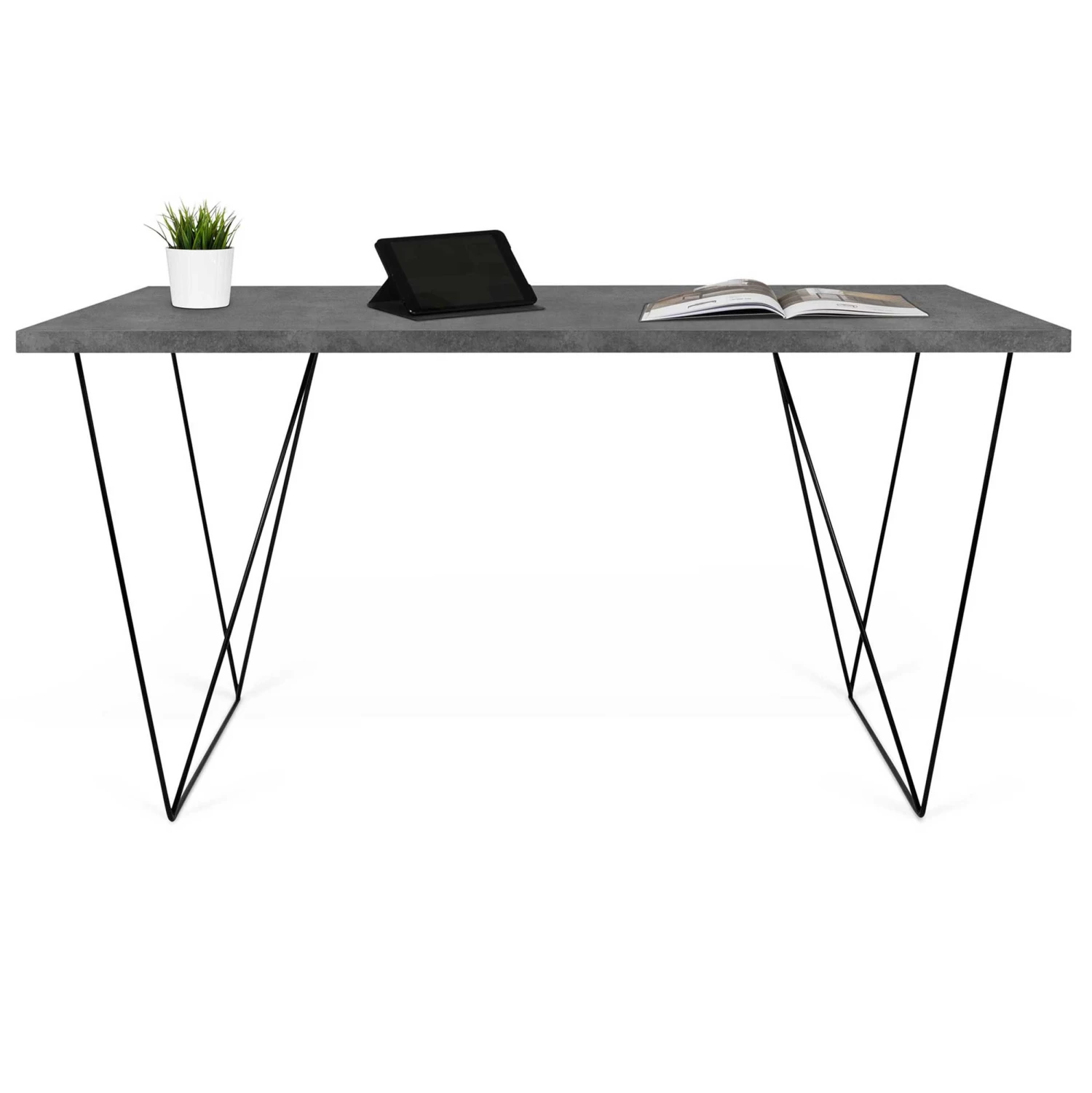 Bureau Flo uit honingraatpaneel, blad met betonlook. Zwarte geometrische pootjes op verschillende manieren te monteren.
