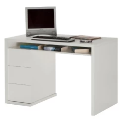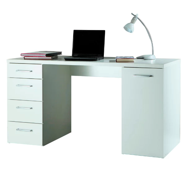 Bureau Morten 139x60x74cm uit spaanplaat met afwerking in witte melamine. Met vier opberglades en draaideur.