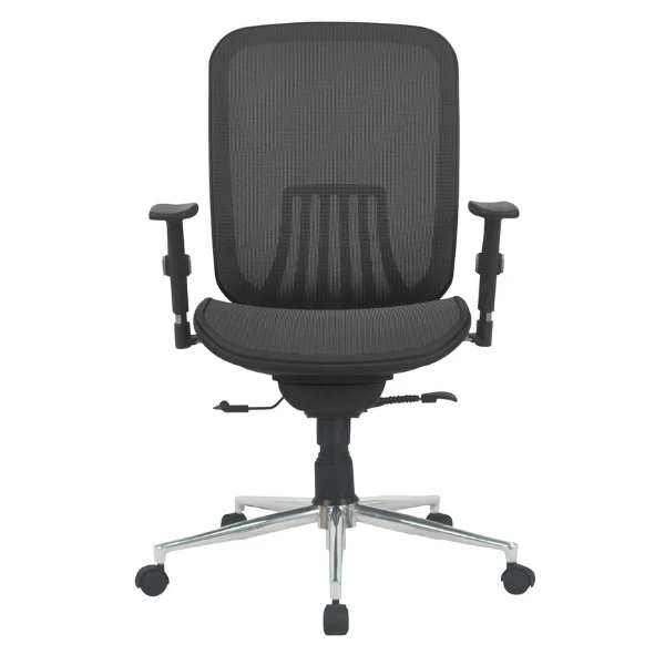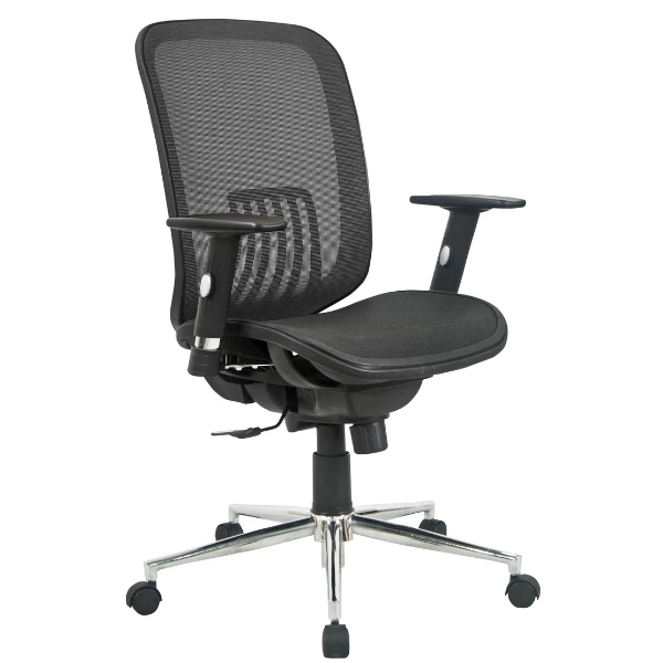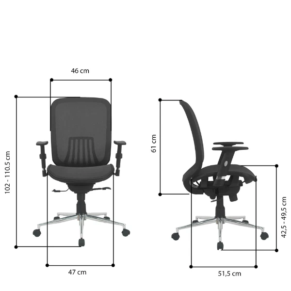 Bureaustoel Alexine heeft een bekleding van gaas en microporeuze stof. De stoel heeft een verchroomd onderstel en nylon wielen en een armleuning uit polypropyleen.