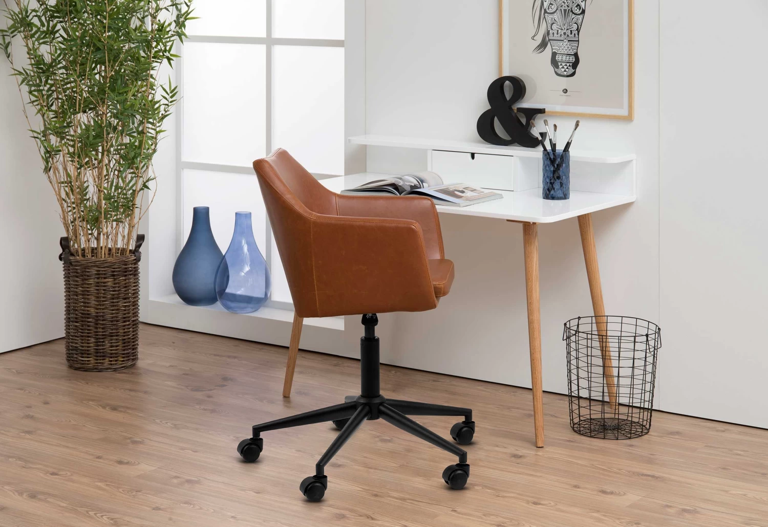 Comfortabele bureaustoel Novan met kussen en wieltjes, in cognackleurig kunstleder.