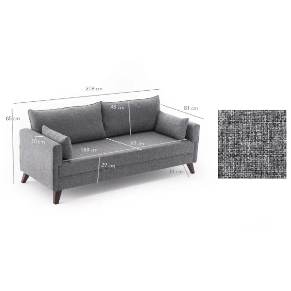 De 3-zitsbank is de perfecte toevoeging aan je woonkamer en combineert comfort en stijl. Hij is gemaakt met een hout/MDF frame en 100% polyester stof en is gemakkelijk schoon te maken. De bank heeft een breedte van 208 cm, hoogte van 85 cm en diepte van 81 cm, met een zithoogte van 43 cm. Het 28 DNS schuim zorgt voor een comfortabele zitervaring, terwijl de harde walnootkleurige kunststof poten een vleugje elegantie toevoegen. Verkrijgbaar in een stijlvolle grijze kleur