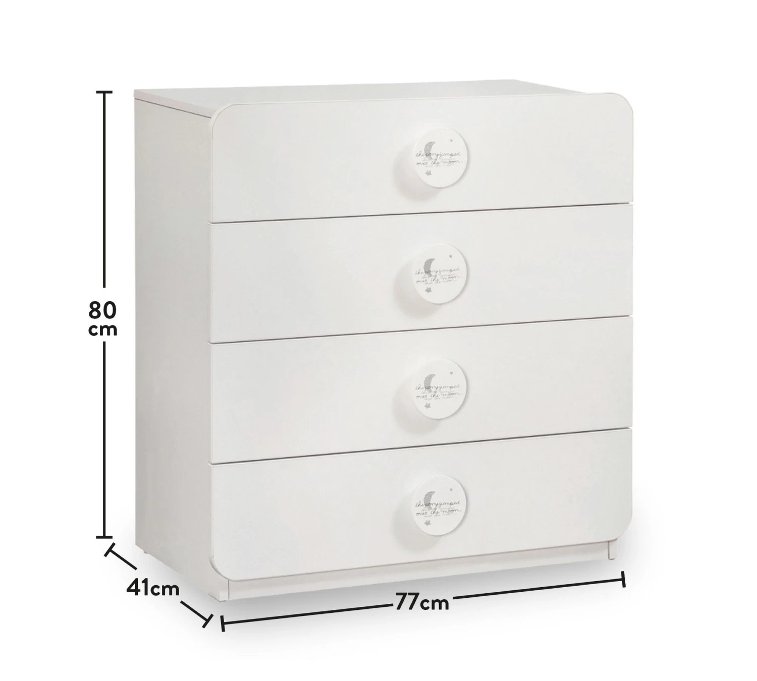 Qua afmetingen heeft de commode een breedte van 77 cm, een hoogte van 80 cm en een diepte van 41 cm. Deze afmetingen maken het perfect voor elke kamer, of het nu een slaapkamer, woonkamer of kinderkamer is. Dankzij het compacte formaat past de commode naadloos in elke ruimte zonder de ruimte te overweldigen.