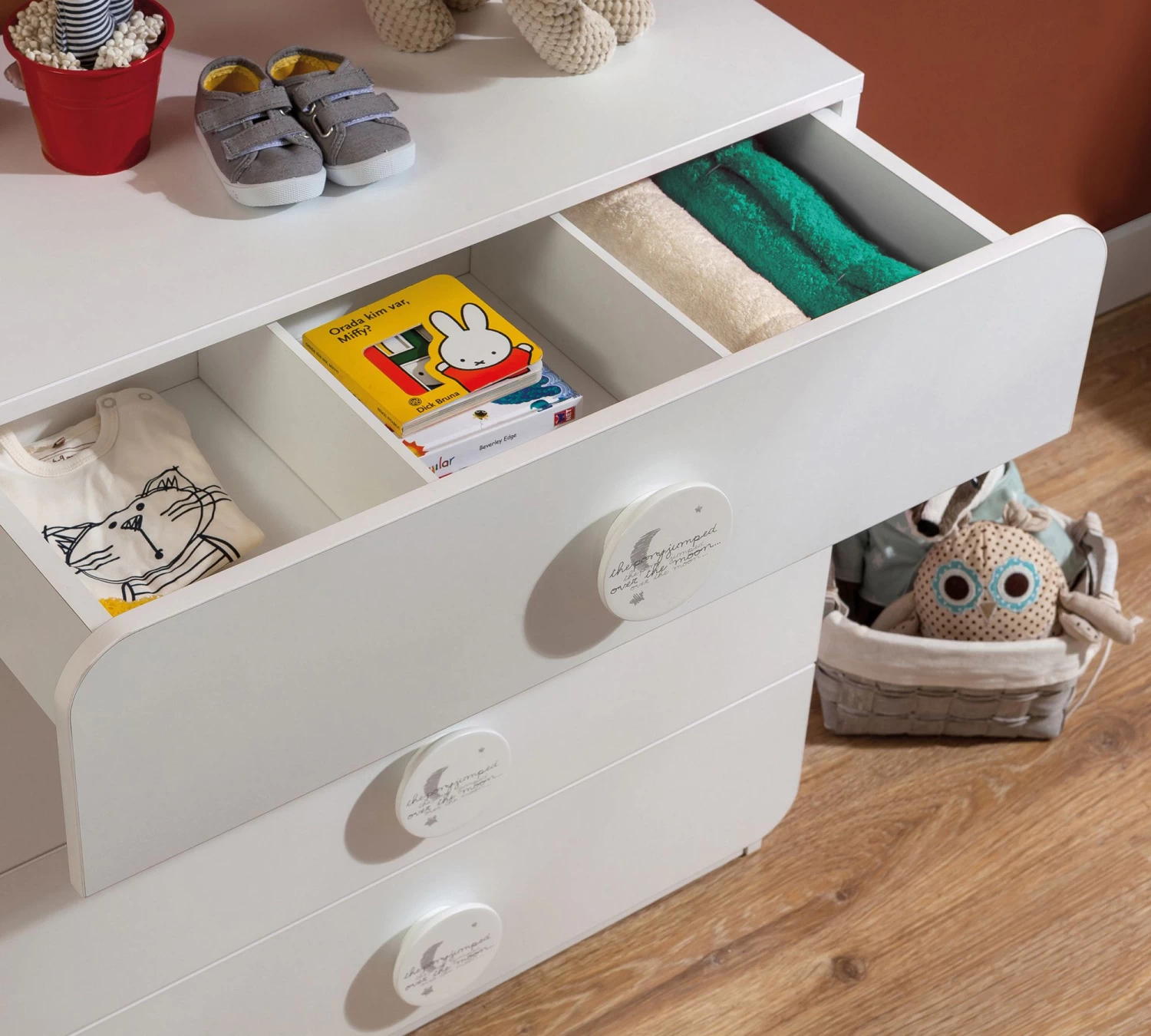 De commode maakt deel uit van de Baby Cotton serie en is verkrijgbaar in een levendige multicolor.