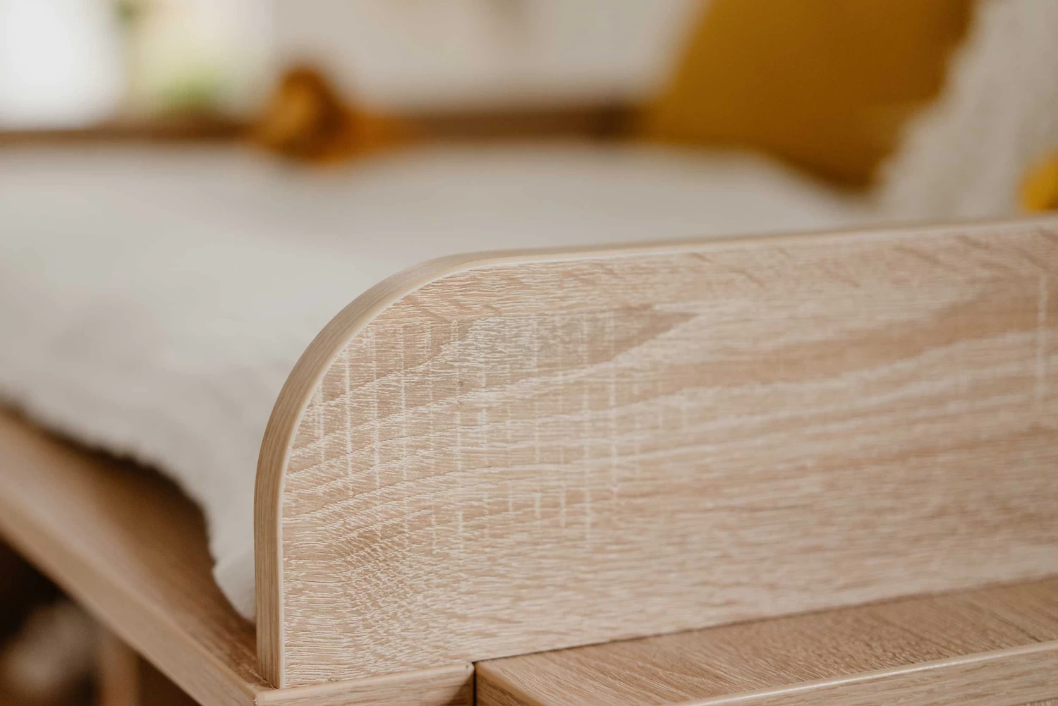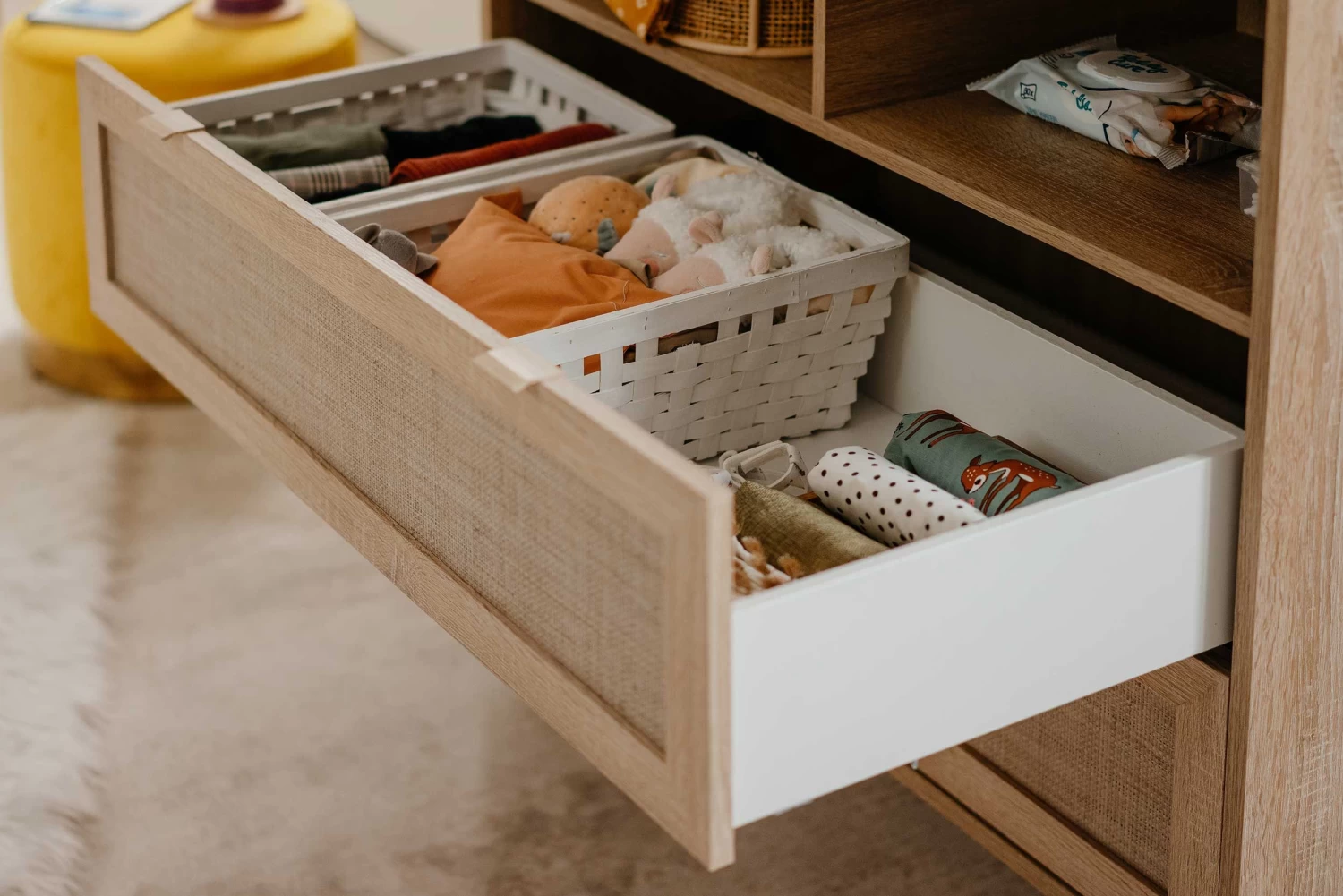 Romantisch-Scandinavisch, dat is hoe we deze Bilal-serie zouden omschrijven. De meubelen van deze reeks zijn gemaakt uit spaanplaat en MDF, in een decor van sonoma eik en afgewerkt met een imitatie van gevlochten Rafia. Dit zorgt voor een unieke look die het midden houdt tussen modern en klassiek. Deze commode is uitgerust met 2 lades en daarboven 2 open vakjes. De geïntegreerde luierplank is een extra troef. De pootjes zijn gemaakt uit massief hout, de handgepen uit kunststof. Ontdek de uitgebreide mogelijkheden van deze reeks op onze website!Â