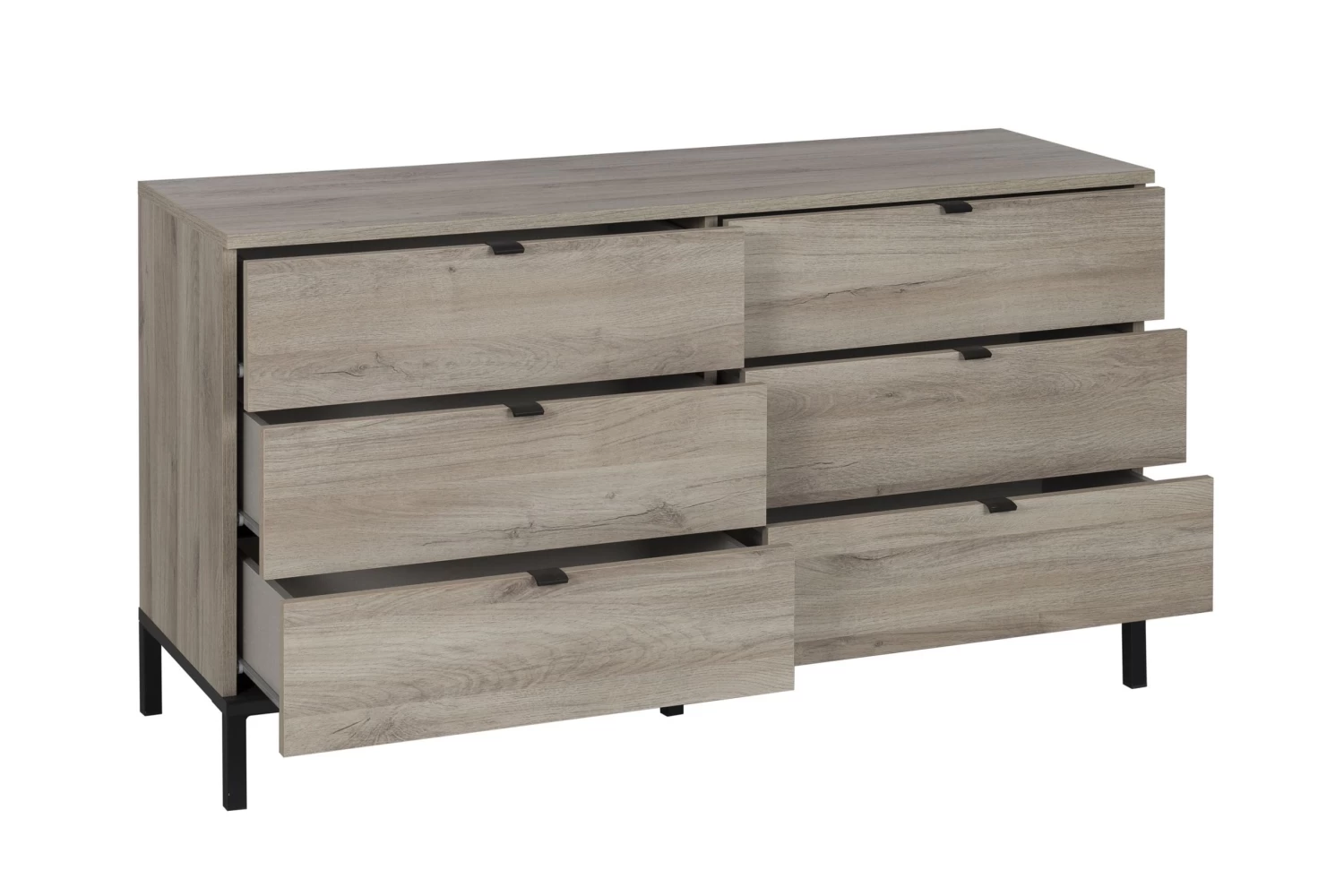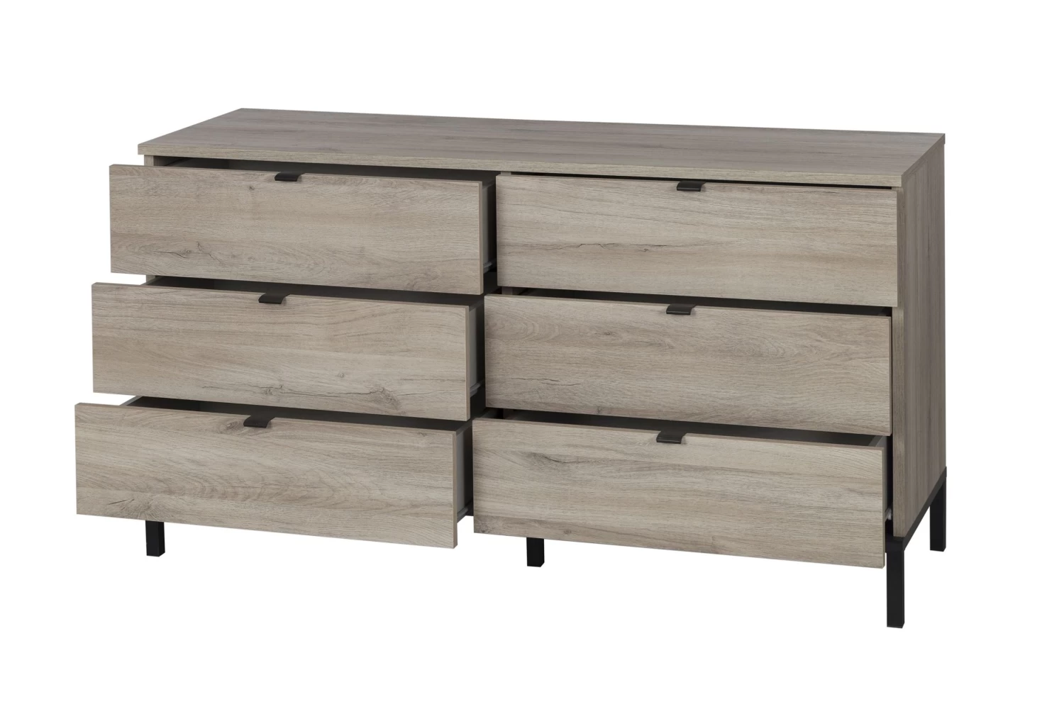 Met de meubelen van de Castle-collectie creëer je een slaapkamer met royale allures. De meubelen van deze collectie zijn gemaakt van spaanplaat met een imitatieprint van helder Krönberg-eik en met afwerking in zwart melamine.