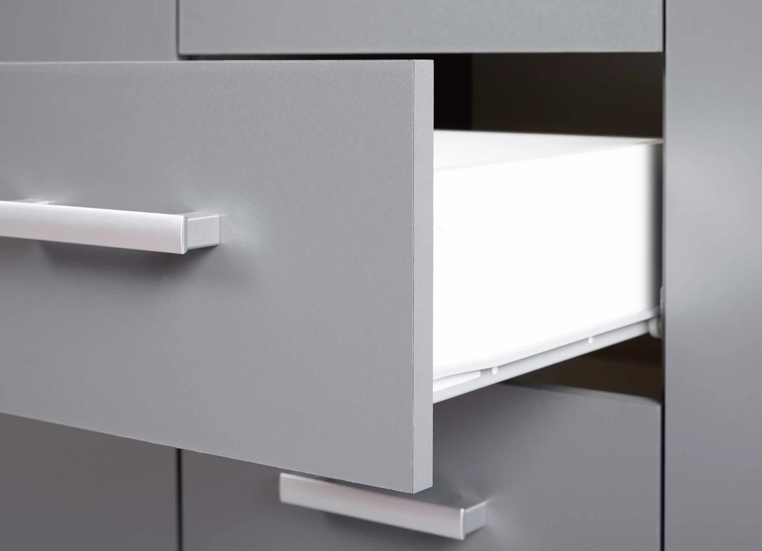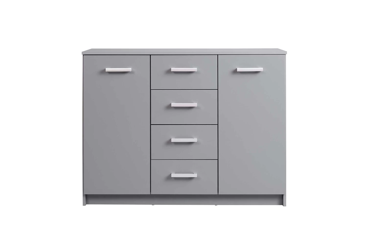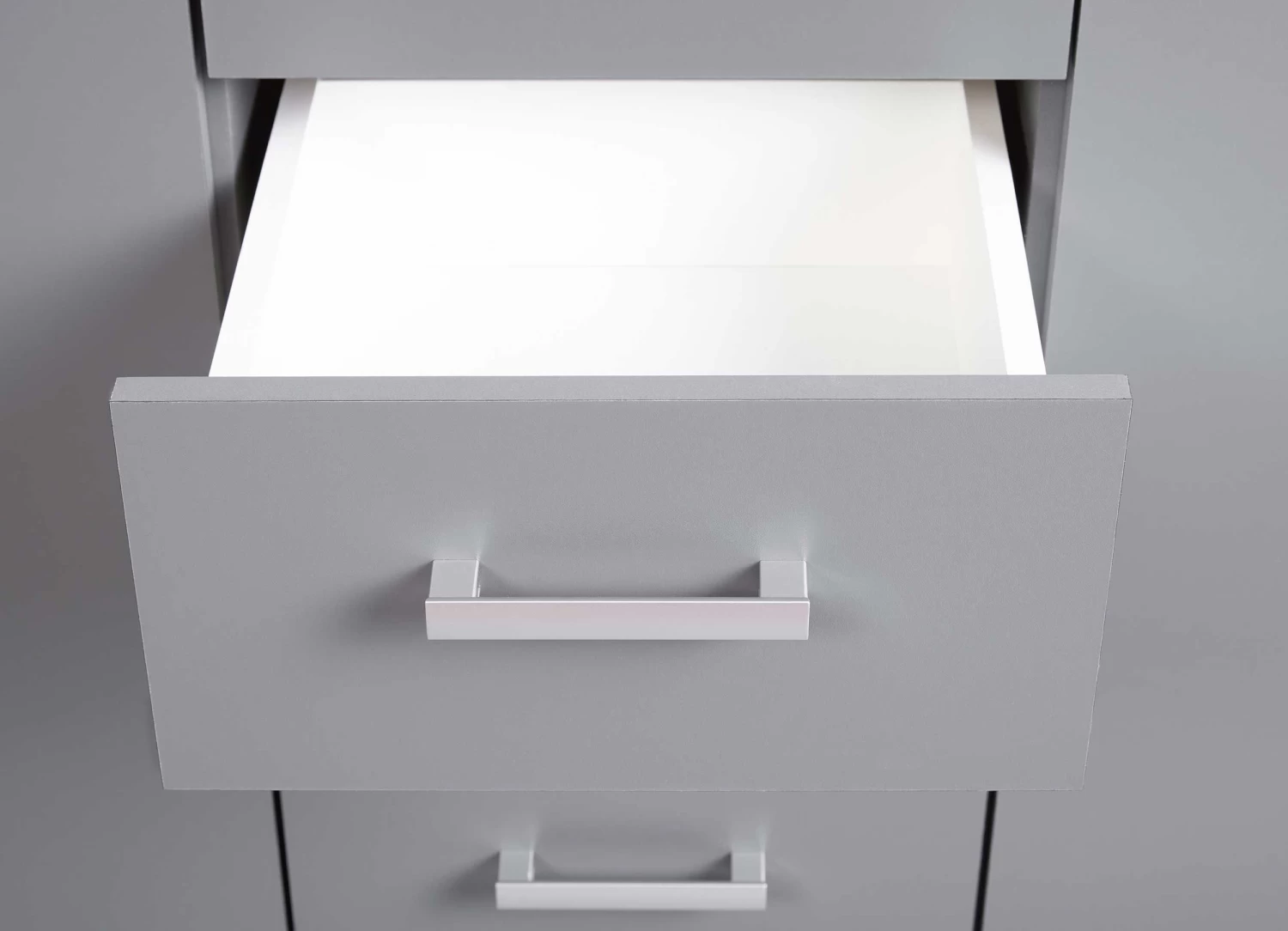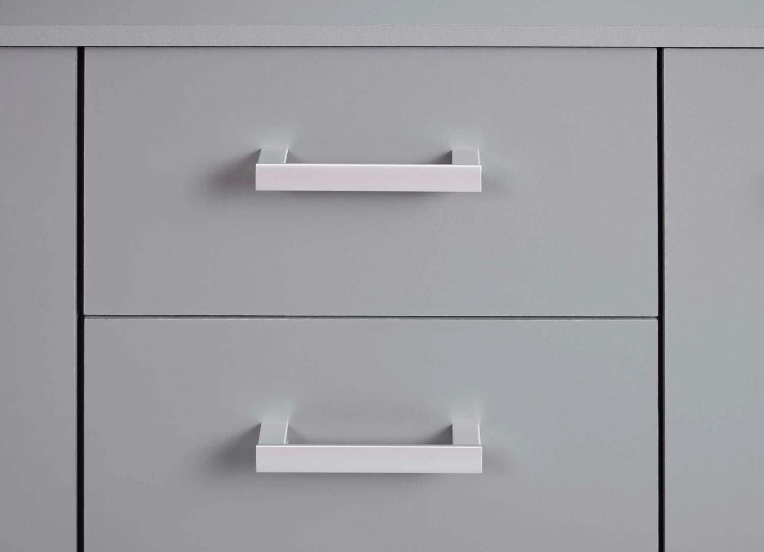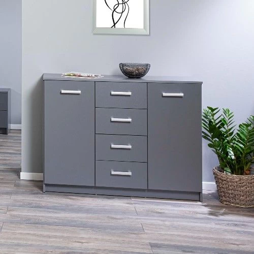 Deze ruime Eden commode is uitgerust met vier lades en twee deuren, waarvan elk met één legplank. De kast bezorgt jouw kantoor de nodige opbergruimte op een stijlvolle manier. De commode is in het grafiet grijs en afgewerkt met zilverkleurige handvaten. Bekijk de andere kantoormeubelen van de Eden-collectie op onze website.Â