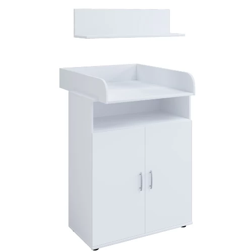 Commode Halula is gemaakt uit gemelamineerde spaanplaat in wit en bestaat uit een luierplank, open vak, 2 draaideuren, 1 legplank en 1 wandplank.Â