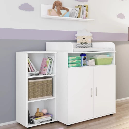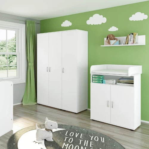 Deze eenvoudige, witte commode biedt alles wat u nodig heeft voor de verzorging van uw kleintje. Zo beschikt hij over een luierplank om uw baby te verversen, een open vak waar u luiers, vochtige doekjes en tetra doeken kunt opbergen, 2 opbergvakken achter de 2 draaideuren voor allerhande verzorgingsproducten en eventueel ook kleertjes van de baby en een wandplankje waar u kinderboekjes en decoratie kunt uitstallen.  Deze commode maakt deel uit van de Halula babykamer maar kan ook gemakkelijk gebruikt worden in elke andere babykamer dankzij zijn neutrale witte kleur en ontwerp. Het neutrale ontwerp en het feit dat u de luiertafel opnieuw kunt verwijderen maakt ook dat u deze commode kunt blijven gebruiken naarmate uw kind ouder wordt. Bekijk ook onze andere meubelen van de Halula babykamer. Schroeven en pluggen voor wandmontage zijn niet inbegrepen.Â