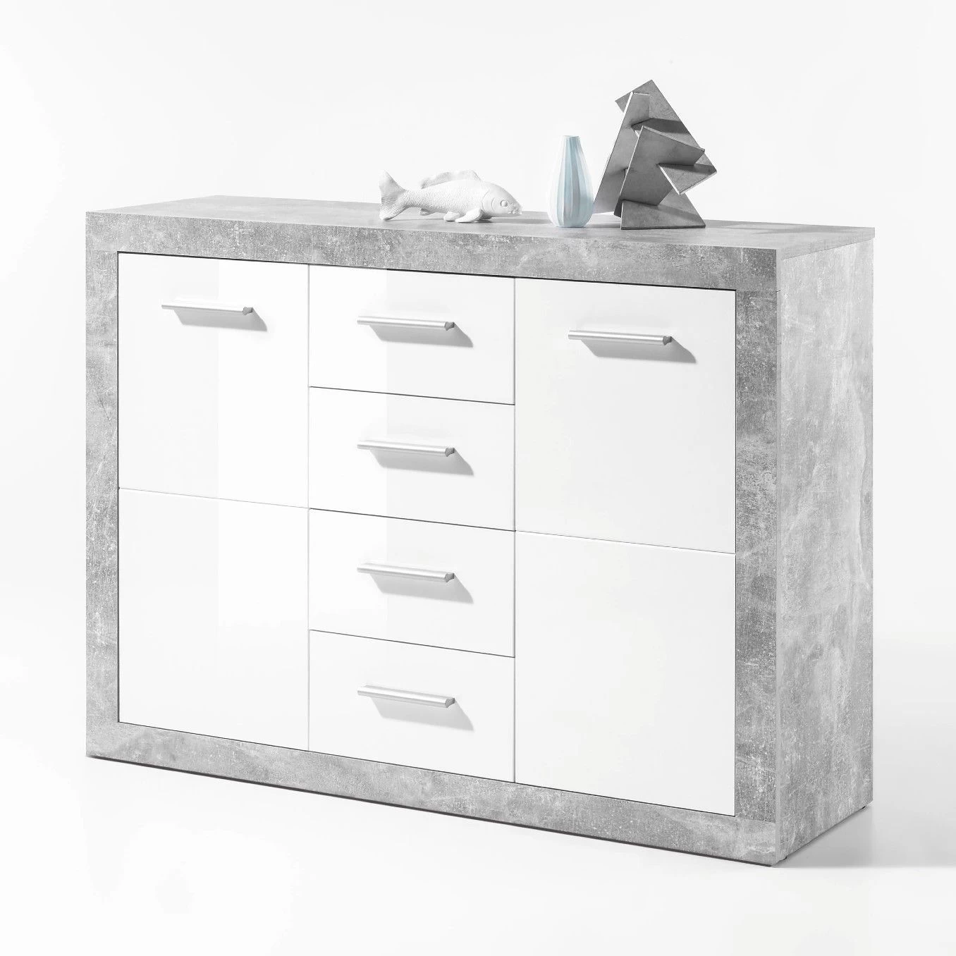 Commode Inga, gemaakt uit spaanplaat in betondecor. De 2 deuren en 4 lades zijn wit, elk voorzien van een handgreep in kunststof.