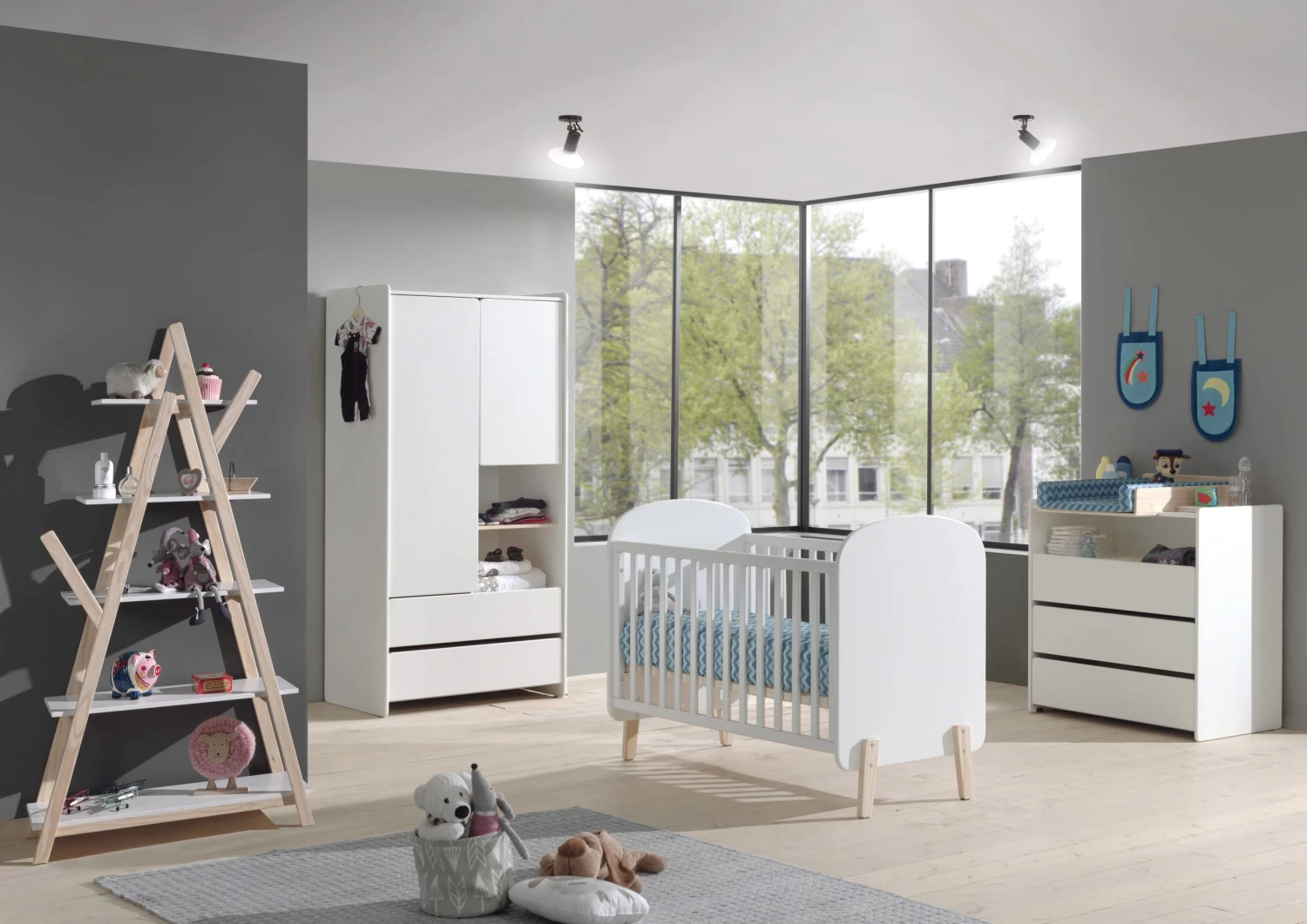Commode Kiddy maakt je babykamer in Scandinavische stijl compleet. De commode is gemaakt van wit gelakte MDF en bestaat uit 3 laden en een open vak. Je kan dit meubelstuk nog verder uitbreiden met een natuurkleurige luierplank uit massief den, die je eveneens kan aankopen op onze site.