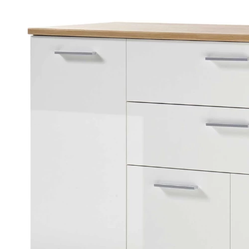 Commode Lobi met 4 deuren en 2 lades. Gemaakt uit spaanplaat met houtdecor en glanzend witte voorkant.
