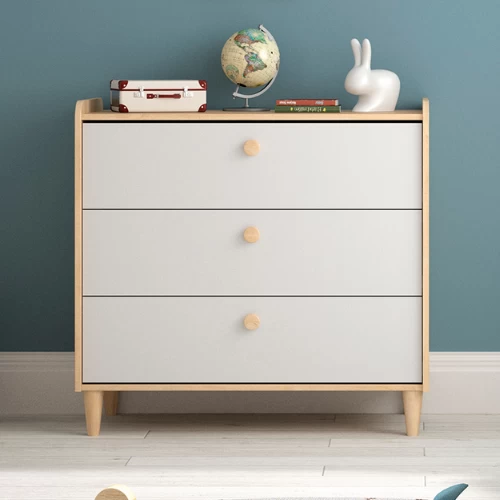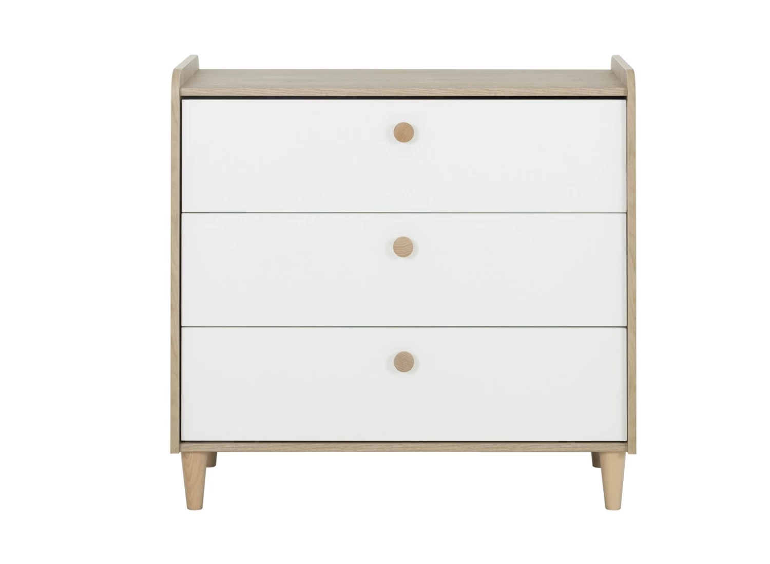Haal een beetje vintage in huis met de meubelen van de Maron-reeks. Deze zijn gemaakt uit spaanplaat in het wit en afgewerkt met eikdecor. De commode heeft haar elegantie te danken aan de beuken handvaten, de afgeronde hoeken en de pootjes. In de drie lades kan je heel wat kleertjes, boeken en verzorgingsproducten opbergen. Optioneel kan je een element toevoegen waardoor je de commode als veilige verzorgingstafel kan gebruiken. Je vindt het bij de volledige babykamer Maron.