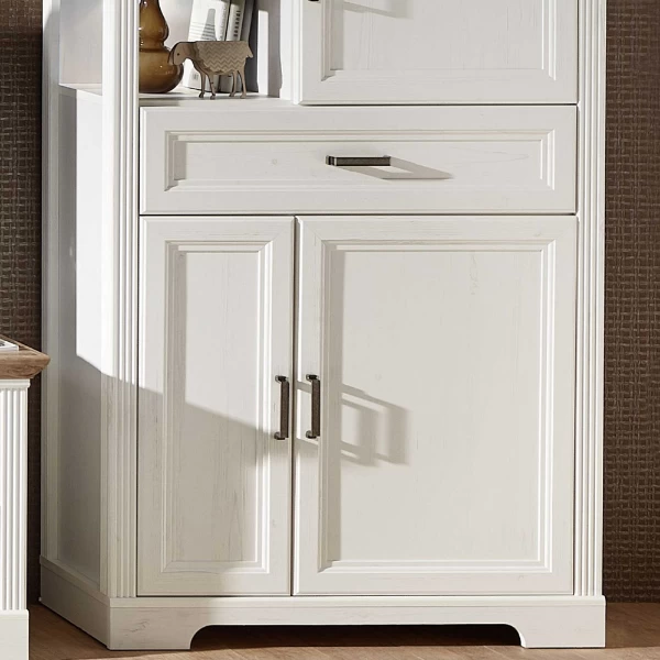 Ga voor de modern landelijke woonstijl met de meubelen van de Samine-reeks, die zijn gemaakt uit spaanplaat in het wit en met afwerkingen in eikdecor. De reeks bestaat ook in grafietkleur. Achter de drie deuren creëer je ruimte om allerlei spullen netjes op te bergen. Gebruik de open vakken om mooie decoratie uit te stallen. Dankzij de lade heb je ook plaats om allerlei kleine spullen op te bergen. Geniet van de opbergruimte met soft-close systeem en metalen handgrepen. Ontdek de volledige collectie Samine op onze website.Â