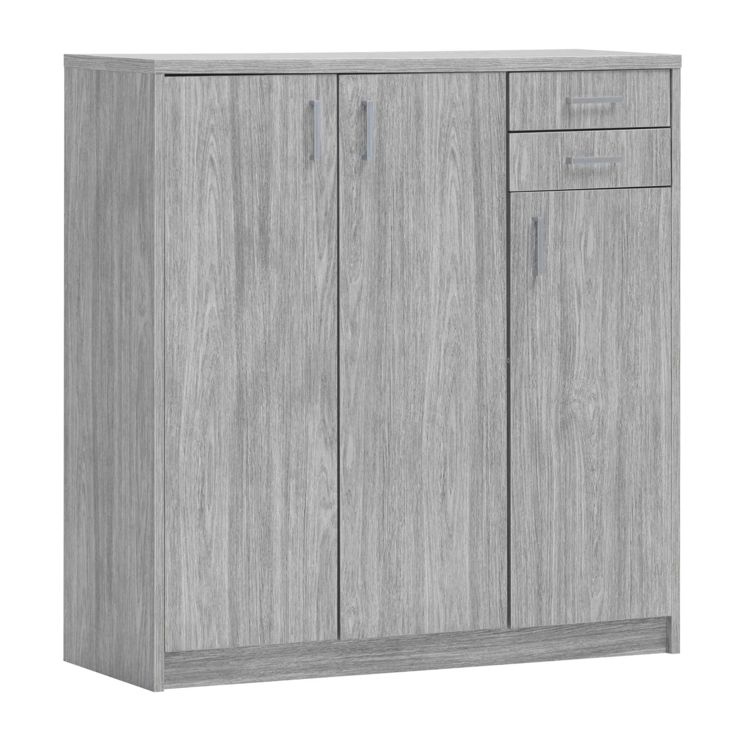 Extra opbergruimte in de woonkamer, slaapkamer of gang creëer je in een handomdraai met deze praktische commode van de Spacio-collectie. De commode is gemaakt van spaanplaat met een decor van grijze eik en beschikt over 3 deuren en 2 laden.