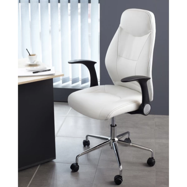 Deze directiestoel heeft een luxueuze uitstraling door zijn mat witte kunstlederen bekleding. De zithoogte van deze bureaustoel is verstelbaar van 47,5 cm tot 58,5 cm. De verstelbare armleuningen en het gecentreerde kantelsysteem dragen eveneens bij aan een comfortabele zitervaring. De wielen beschikken over remmen die zorgen voor extra veiligheid. Ga voor comfortabele werkdagen met directiestoel Brianna!