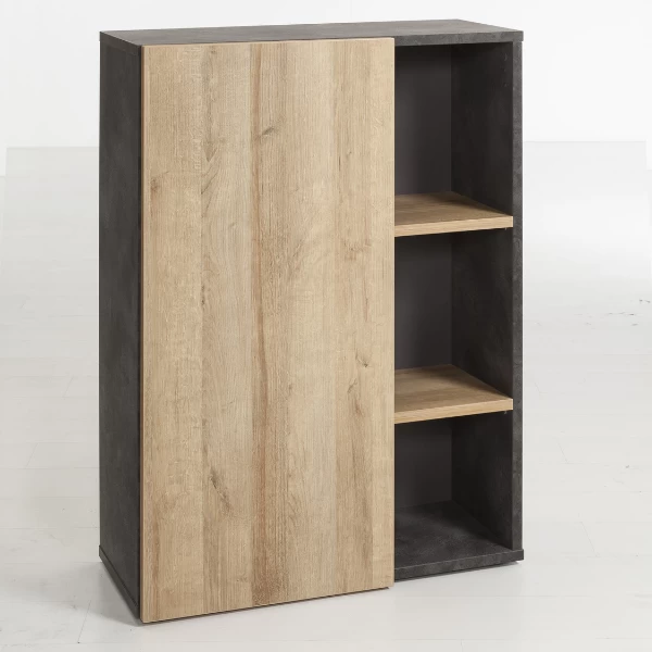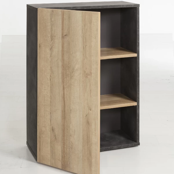 Dossierkast Cory 80x35x110.70cm uit spaanplaat met afwerking in melamine in eikdecor en betonlook. Met draaideur en twee legplanken.