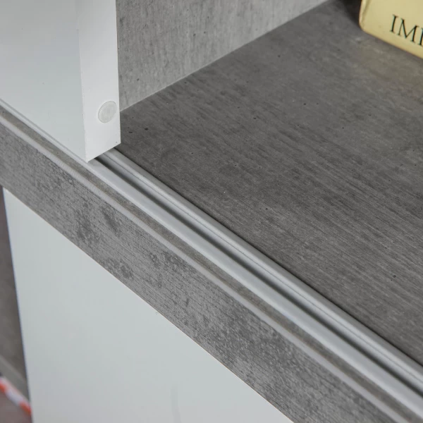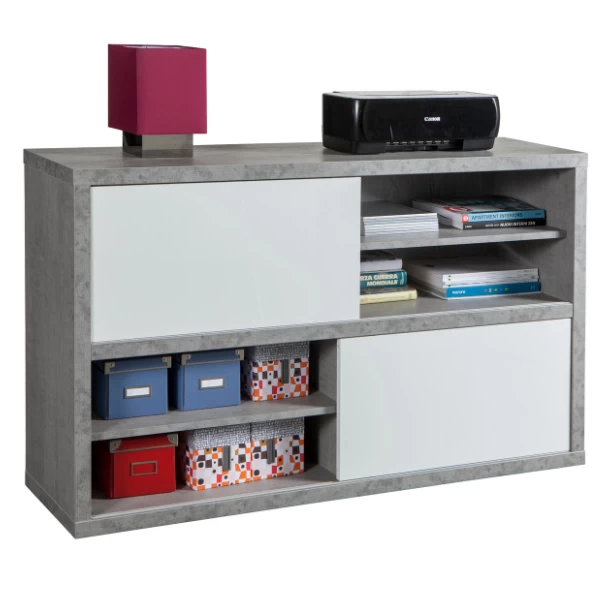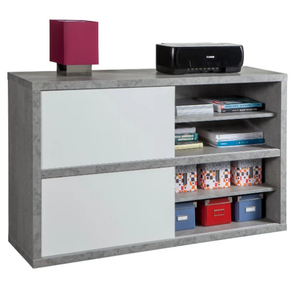 Dossierkast Prato 140x36x87cm uit spaanplaat met afwerking in melamine in betonlook en hoogglans wit. Met twee schuifdeuren.