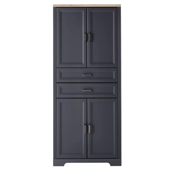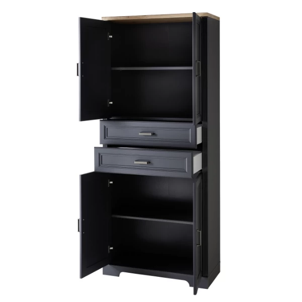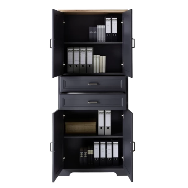 Dossierkast Samine 86x38x204cm met vier deuren en twee lades. Gemaakt uit spaanplaat in grafiet en eikdecor met metalen handgrepen.