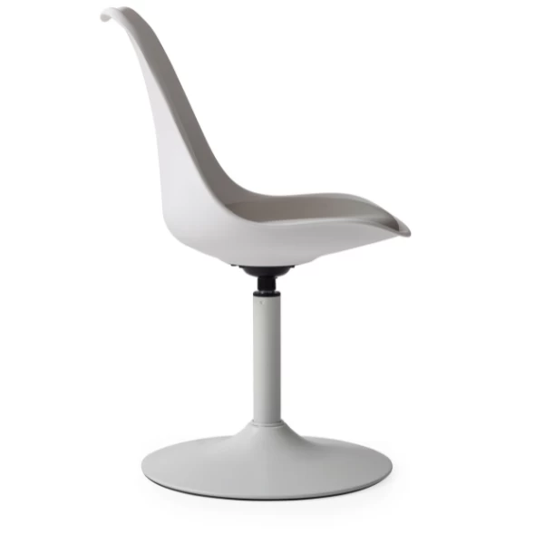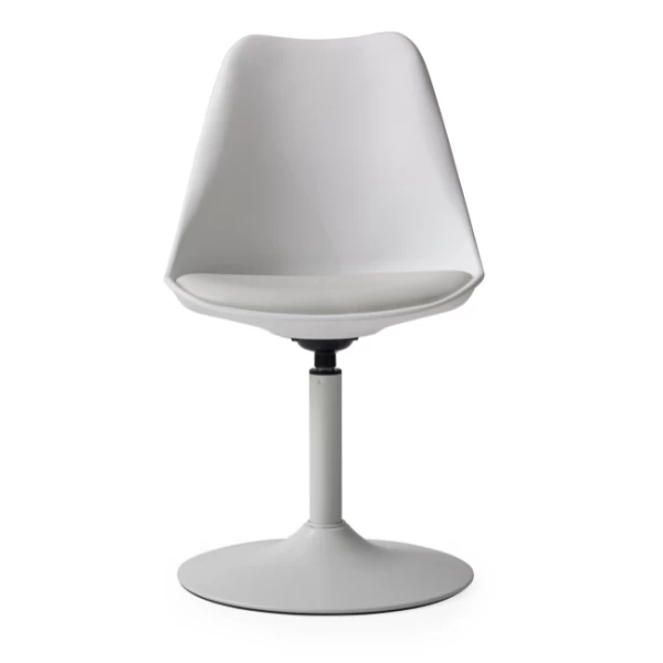 Draaistoel Vive is perfect voor mensen die niet stil kunnen zitten of regelmatig verstrooid zijn. Deze draaistoel kan namelijk om zijn as draaien. Ben je aan het studeren en ben je (alweer) vergeten een boek te pakken? Geen probleem, draai je al zittend om en pak het. Heb je last van rusteloze benen? Geen probleem, met deze stoel kun je met een gerust hart rondjes draaien en met je benen wiebelen. De Vive-stoel heeft een witte kuip uit polypropyleen (harde kunststof) en een lichtgrijs zitkussen uit kunstleer. De trompetvoet is gemaakt uit wit gepoedercoat metaal en zorgt ervoor dat de stoel zeer stabiel staat.Â