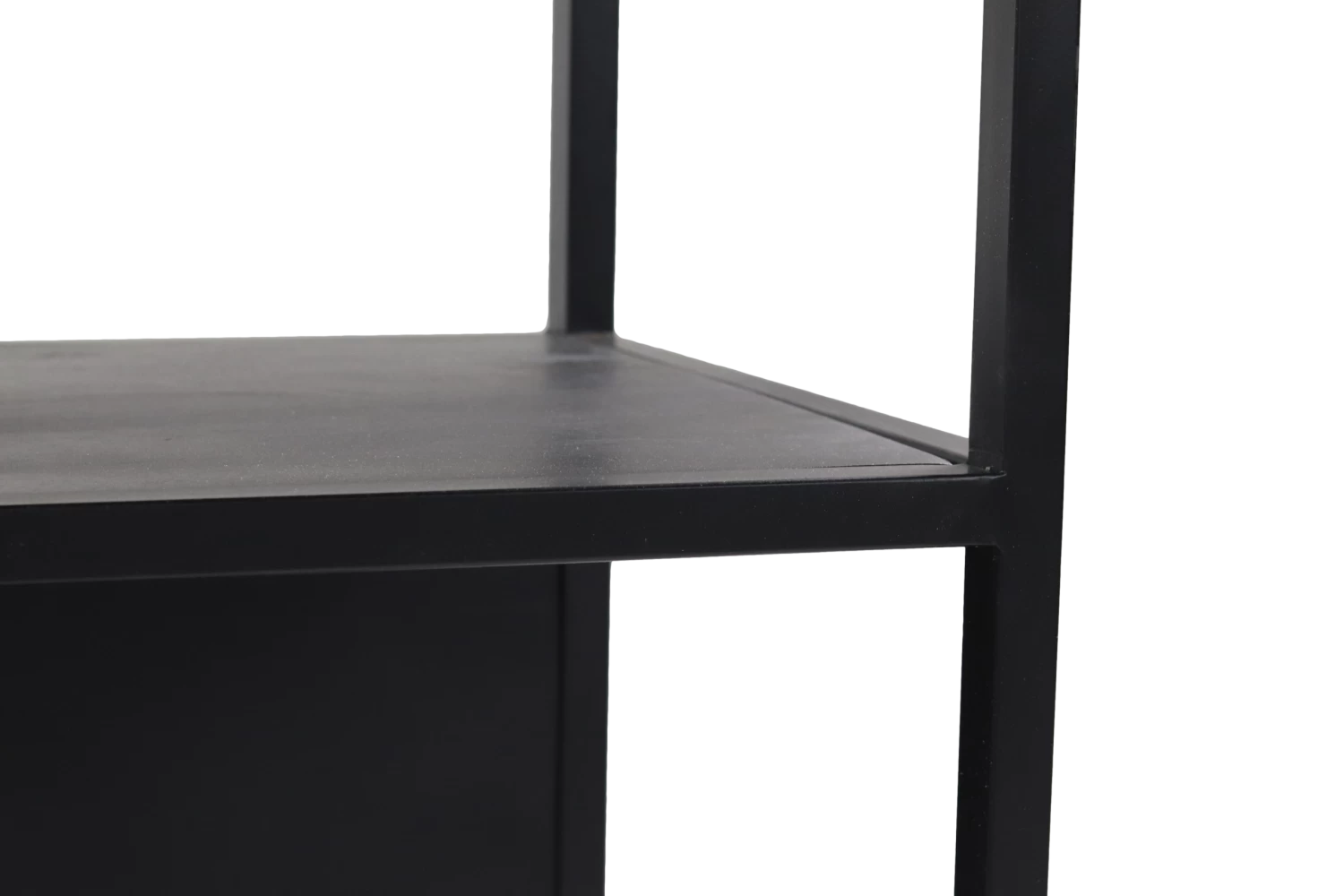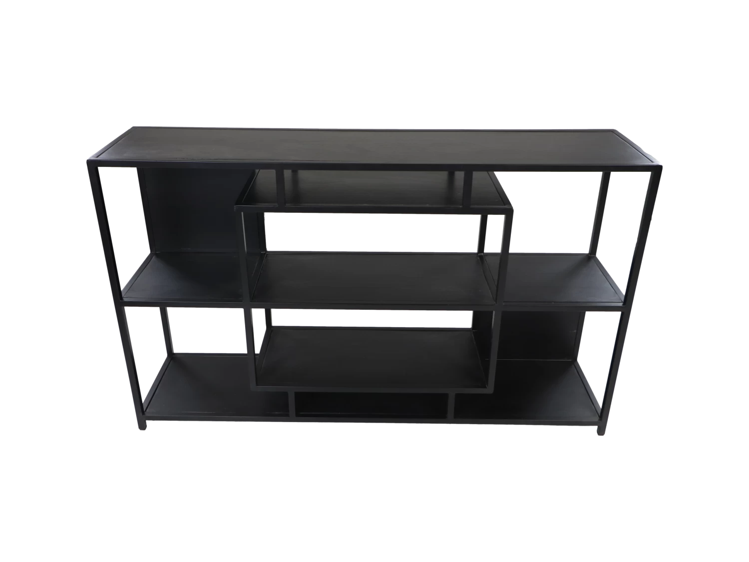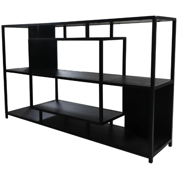 In dit open dressoir Levels kan je je mooiste spullen tentoonstellen. De kast bestaat uit een zwart metalen frame met legplanken in mangohout. Door de verschillende hoogtes van de legplanken kan je zowel kleine decoratieartikelen als grotere items als boeken en planten uitstallen.Â