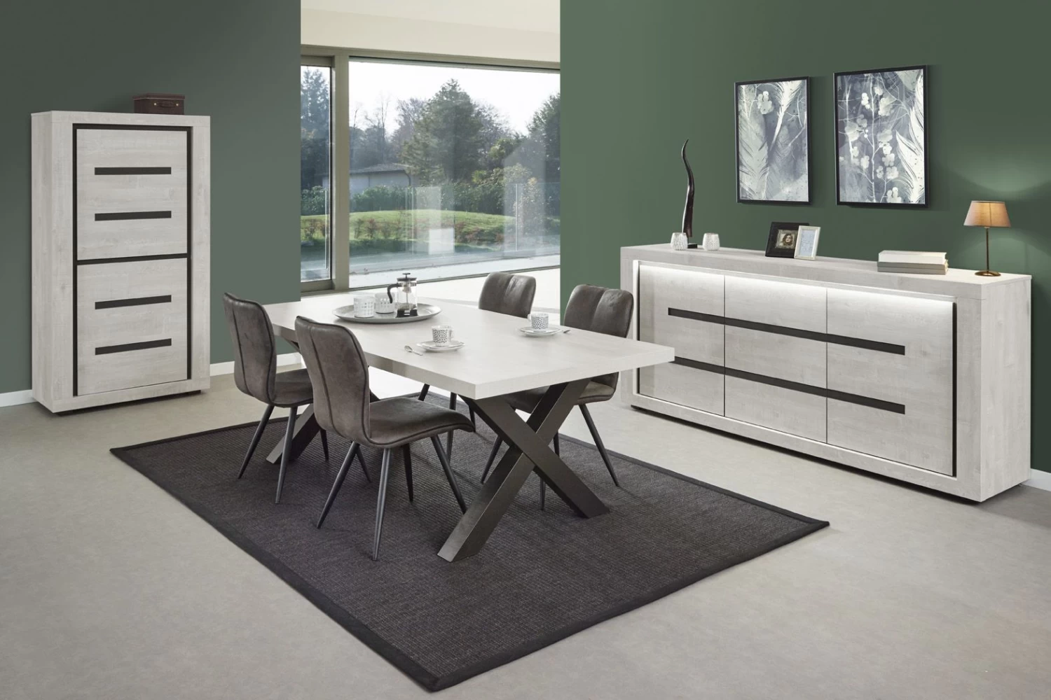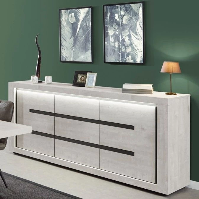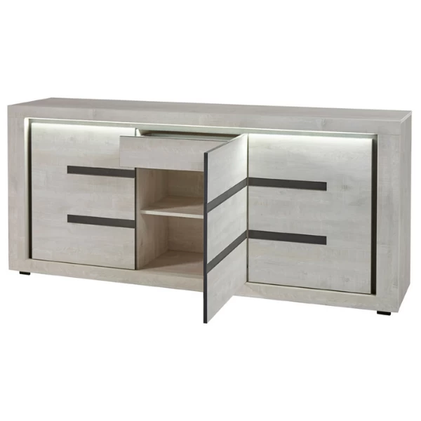 Een stijlvolle dressoir die je tegelijk voldoende opbergruimte biedt, mag zeker niet ontbreken in jouw eetkamer. Dit dressoir van de collectie Ludo heeft een lichtgrijze kleur en is afgewerkt met donkere randen en horizontale lijnen. De kast uitgerust met drie deuren en een handige lade in het midden. Binnenin vind je achter elke deur een legplank. Bovendien kan je de kast versieren met de inbegrepen ledverlichting! De voorzijde van dit meubel is vervaardigd uit MDF, de zijkanten en de bovenzijde uit spaanplaat.