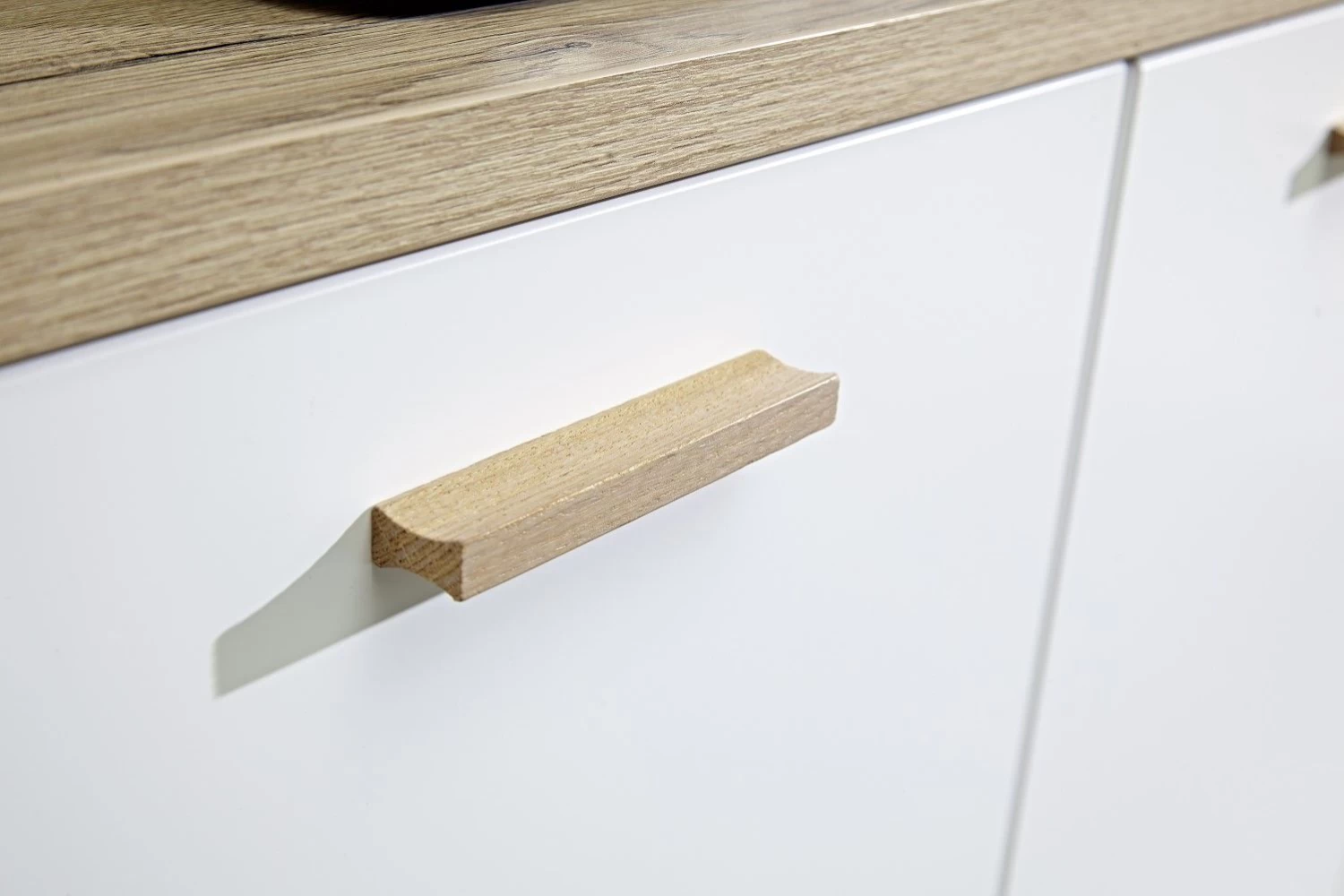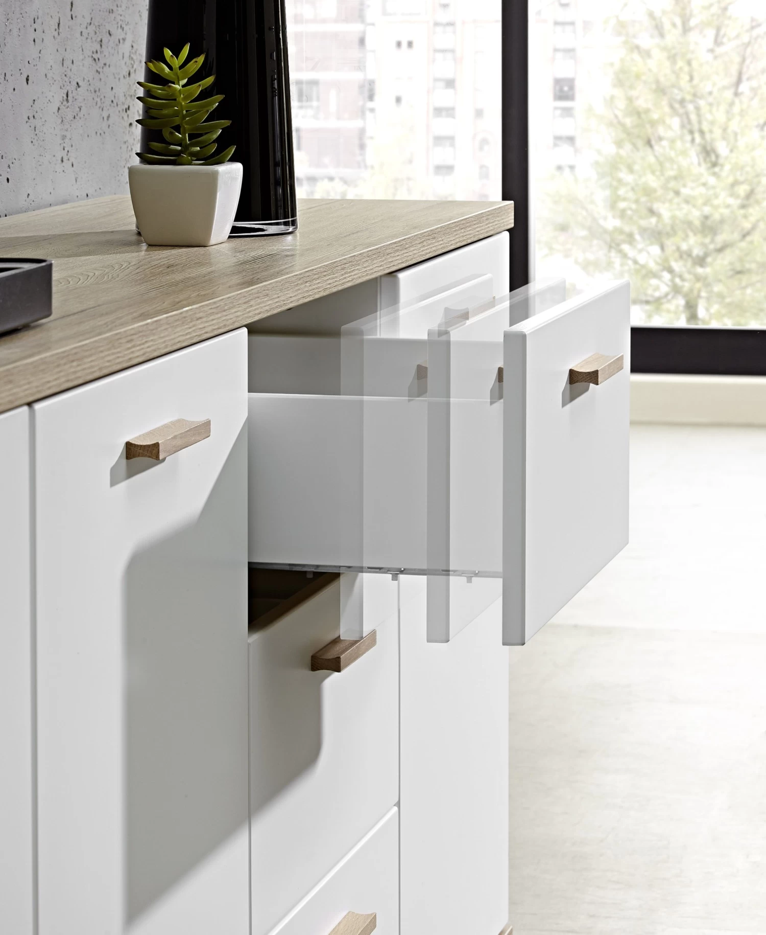 De witte Ousmane-reeks uit gelamineerde spaanplaat met accenten in eikdecor van Germania trekt alle aandacht naar zich toe. De natuurlijke uitstraling van de meubels in een modern-Scandinavische stijl is onmiskenbaar. Dit functionele dressoir kan dienst doen als eyecatcher in zowel woon- als slaapkamer. De combinatie van de karakteristieke massief houten poten en handgrepen met de matte, thermogevormde MDF-fronten is een schot in de roos. Het meubel is opgebouwd uit drie zelfsluitende lades en twee deuren met soft-close. De legplanken achter de deuren zorgen voor extra opbergruimte.Â