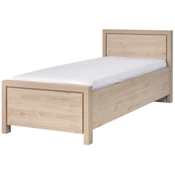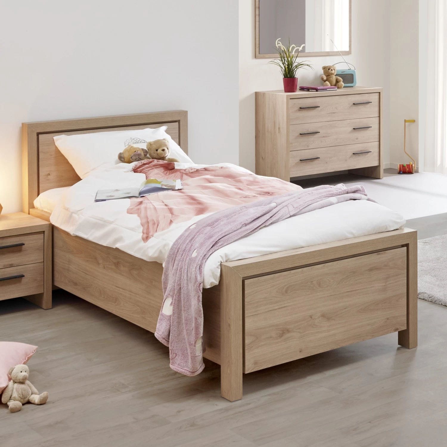 Eenpersoonsbed Lavio 99x217x95cm uit spaanplaat met afwerking in eikdecor. Geschikt voor een matras van 90x20cm. Matras niet inbegrepen.