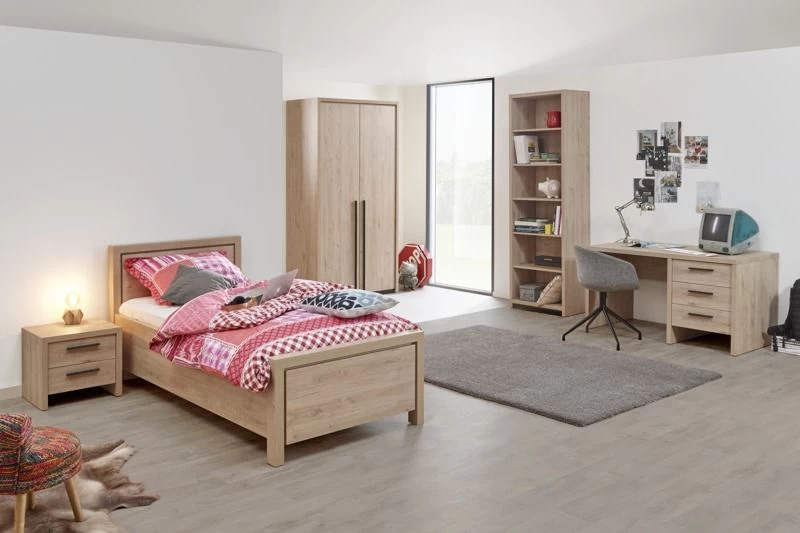 De Lavio-collectie wordt gekenmerkt door het kleurcontrast van het lichtbruine eik decor en de zwarte details. Deze meubelen zijn gemaakt uit spaanplaat en afgewerkt met fijne laag melamine. Dit bed is geschikt voor een matras van 90x200cm. De matras en lattenbodem zijn niet inbegrepen, maar kunnen besteld worden op onze website. Combineer dit bed met de andere meubelen uit de Lavio-collectie om een mooi geheel te vormen.