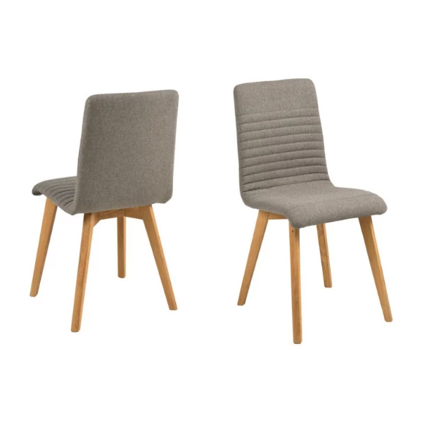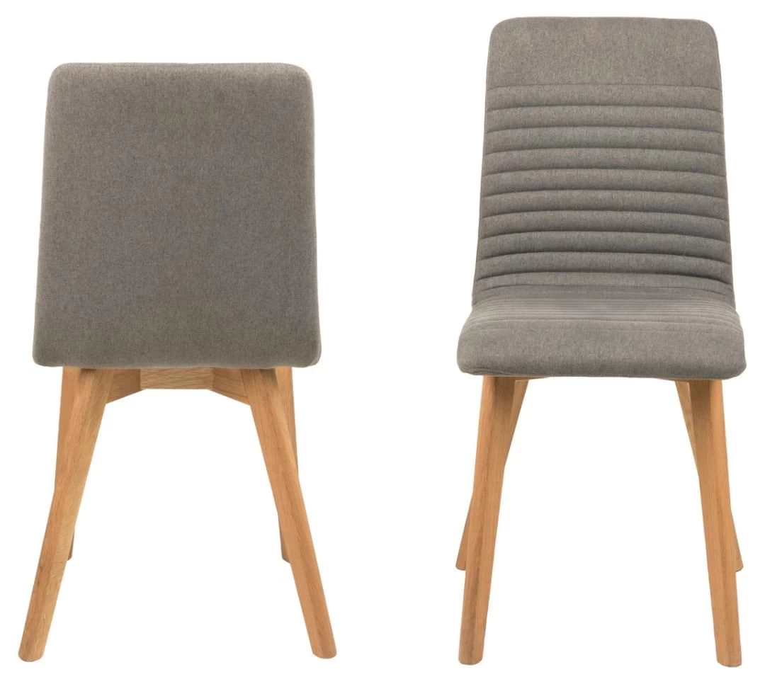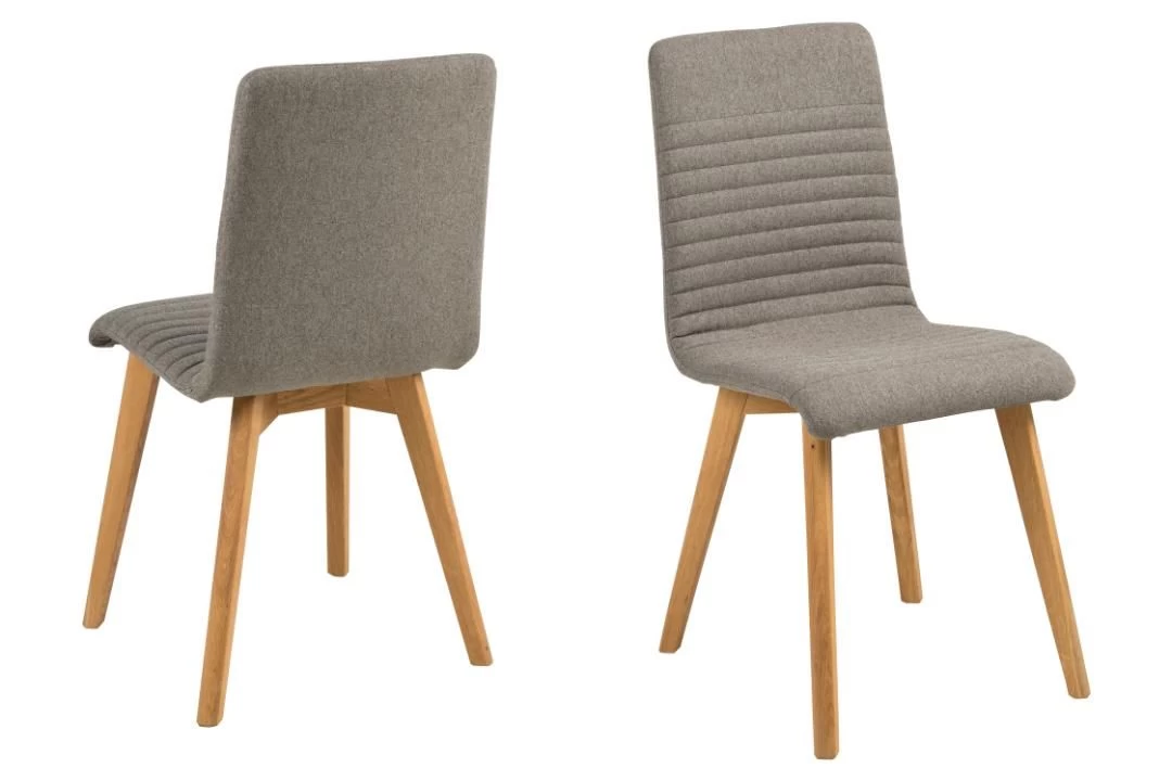 Eetkamerstoel Armosa, gemaakt uit massief eikenhout met een grijze stoffen bekleding.Â