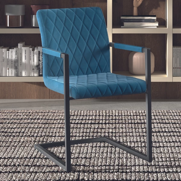 Eetkamerstoel Britt heeft een luxueuze uitstraling door zijn bekleding in blauw velours. Het ruitjespatroon geeft de stoel net dat ietsje meer pit. De strakke sledepoten maken de look compleet. Verkrijgbaar in verschillende uitvoeringen.