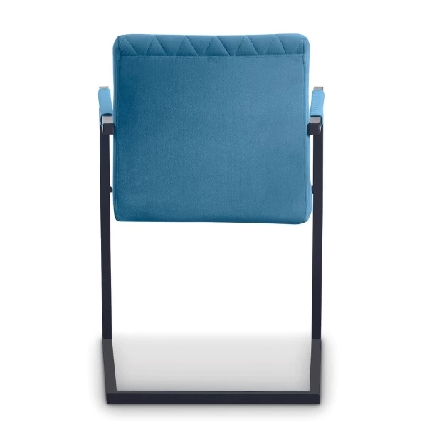 Eetkamerstoel Britt heeft een bekleding in blauw velours en heeft zwarte metalen sledepoten.