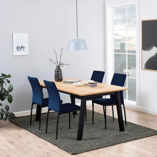Door de combinatie van de donkerblauwe bekleding en zwart gepoedercoate poten straalt eetkamerstoel Demina klasse en glamour uit. Ook de hoge rugleuning, die bovendien zorgt voor extra comfort, draagt hiertoe bij. Omdat (donker)blauw een aardetint is, kan deze gemakkelijk met andere aardetinten zoals grijs, beige en bruin gecombineerd worden. Eetkamerstoel Demina is ook met een donkergroene bekleding verkrijgbaar.Â
