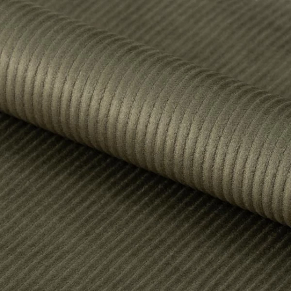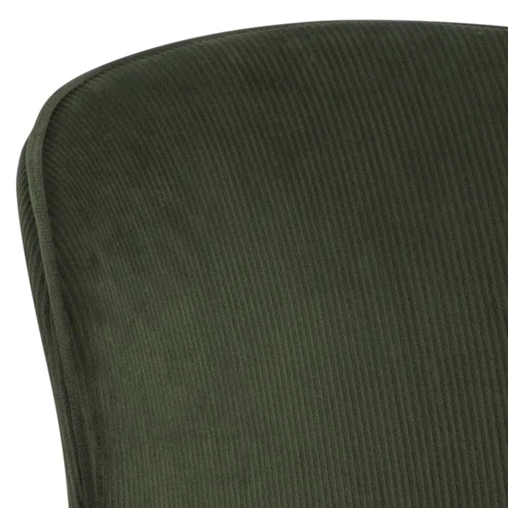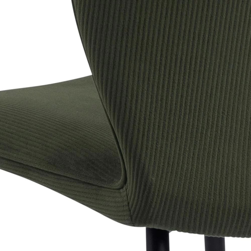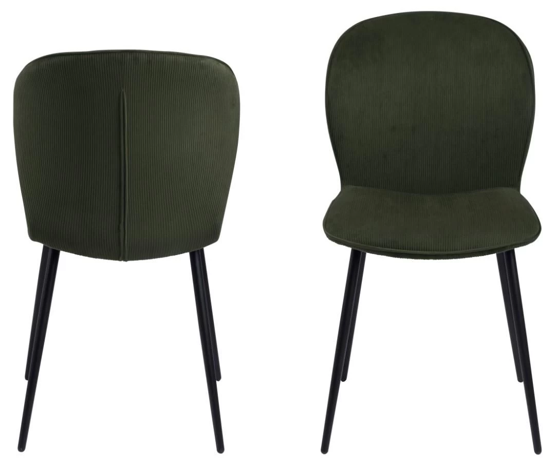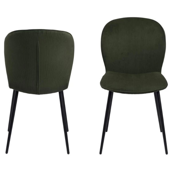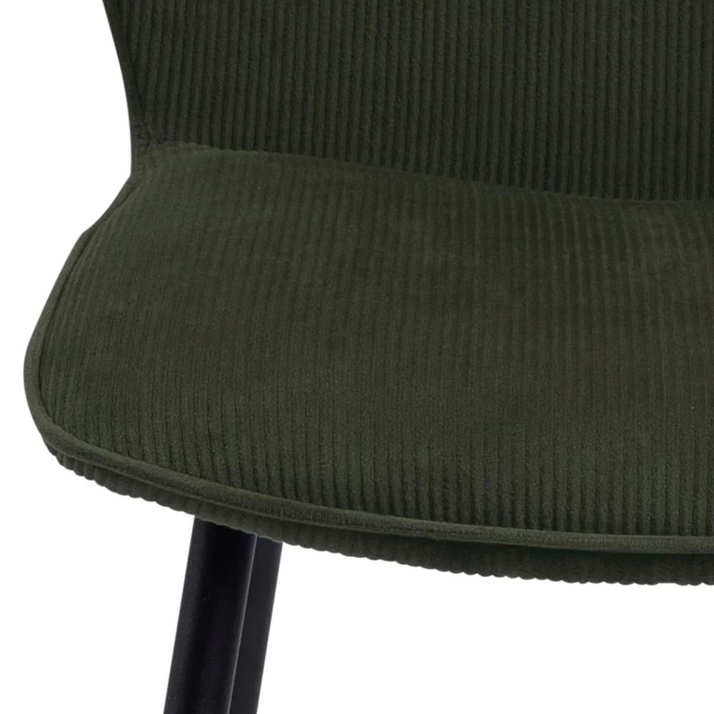 Eetkamerstoel Evelyn met een olijfgroene bekleding uit corduroy (ribfluweel) en zwarte metalen poten.
