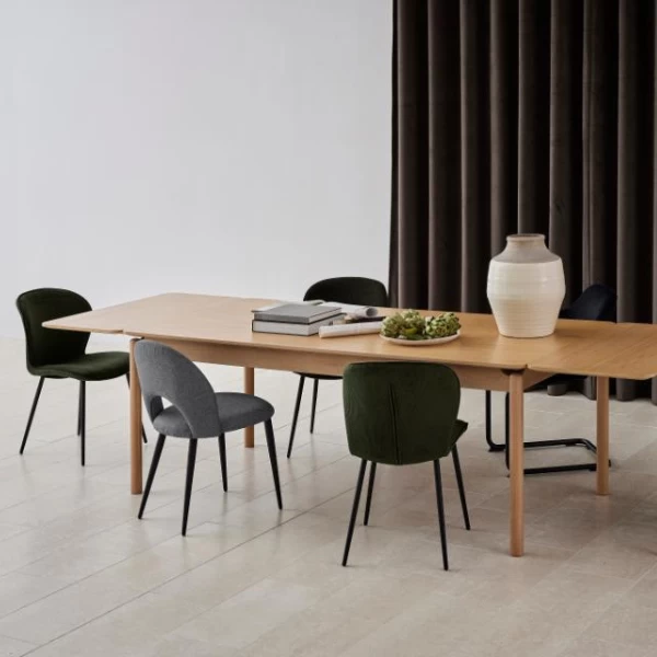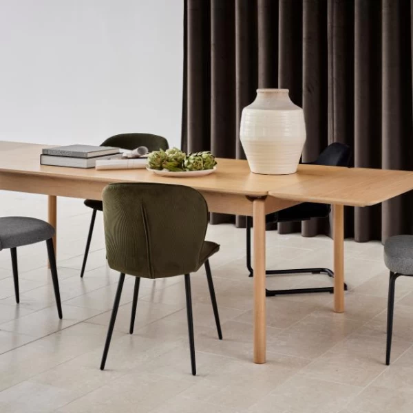 Creëer een gevoel van balans, rust en harmonie in jouw eetkamer met deze olijfgroene eetkamerstoelen. Niet alleen zijn prachtige kleur, maar ook zijn zachte bekleding uit corduroy maakt deze stoel tot een must-have. Door het gebruik van ribfluweel verkleurt de bekleding bijna niet en blijft de stoel dus extra lang mooi. Eetkamerstoel Evelyn beschikt bovendien over 4 zwarte metalen poten die voor voldoende stabiliteit zorgen. De stoel is ook nog beschikbaar met een currygele of grijze bekleding.