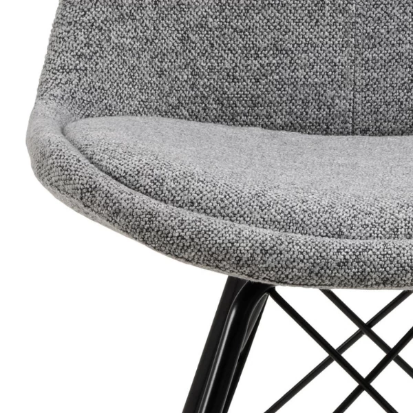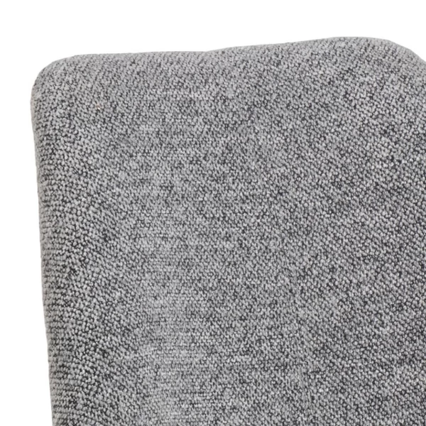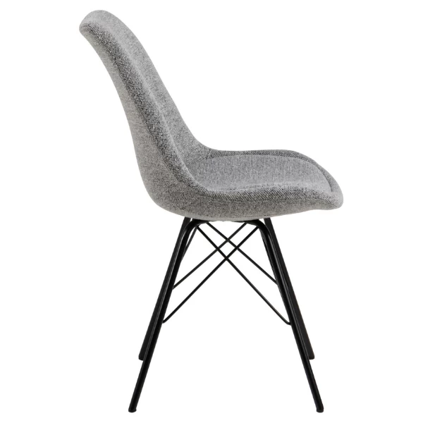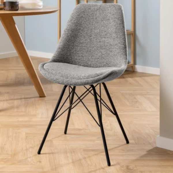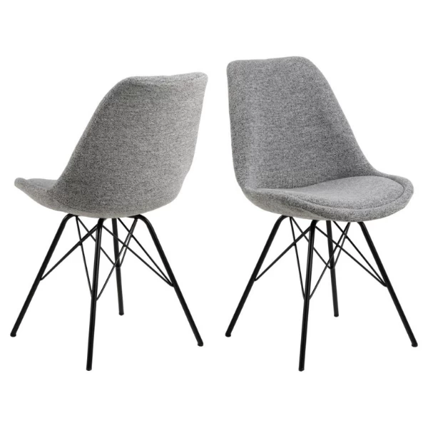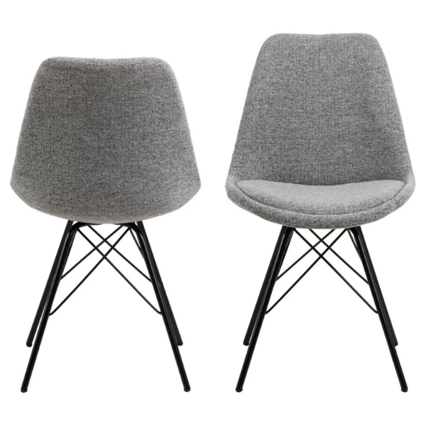 Eetkamerstoel Irma, samengesteld uit lichtgrijze stof en zwarte poten uit gepoedercoat materiaal. Verkocht per 2.Â