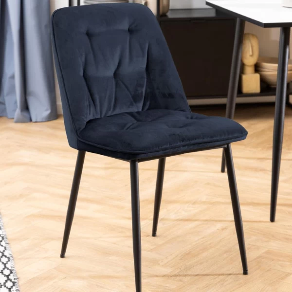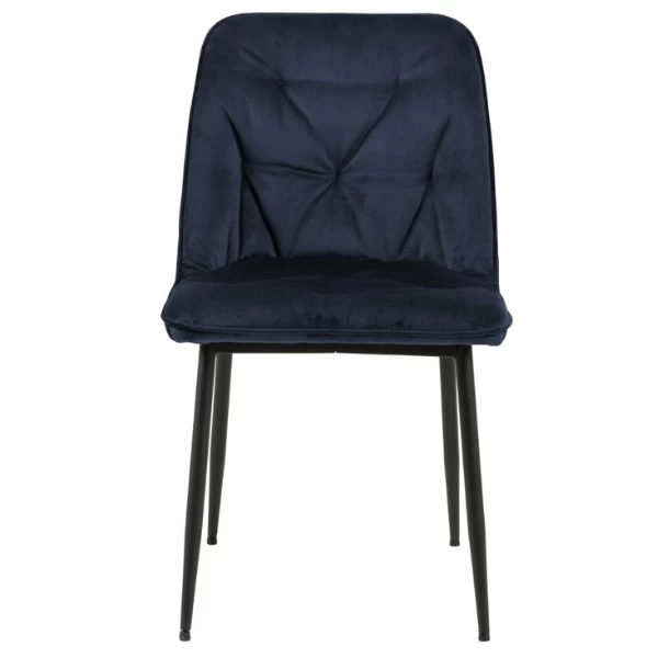 Eetkamerstoel Lynn met zwarte metalen poten en bekleding in donkerblauw velvet.