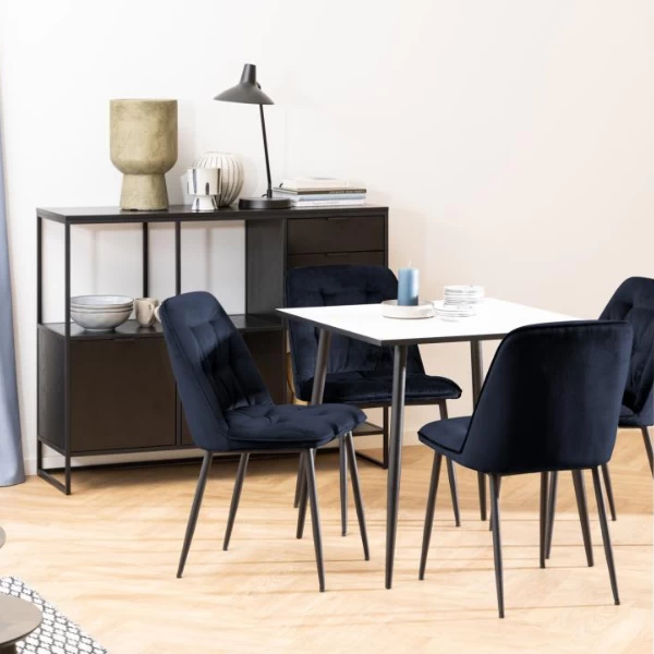 Deze gestoffeerde eetkamerstoel Lynn is bekleed met donkerblauw fluweel en geeft een chique en luxueuze uitstraling aan je eetkamer. Tegelijk zorgen de mat zwarte poten uit gepoedercoat metaal voor een stoere toets. Het ergonomische ontwerp en de zachte zitting zorgen voor een optimaal zitcomfort. De stoelen Lynn zijn beschikbaar in verschillende kleuren en uitvoeringen. Vind je favoriet op onze website.
