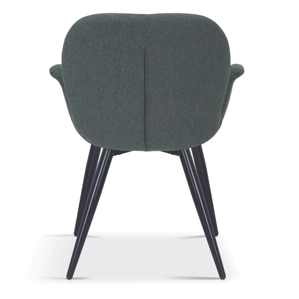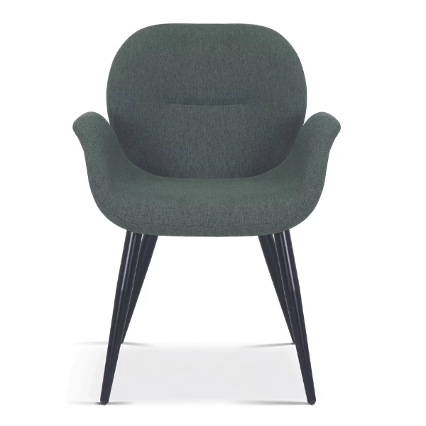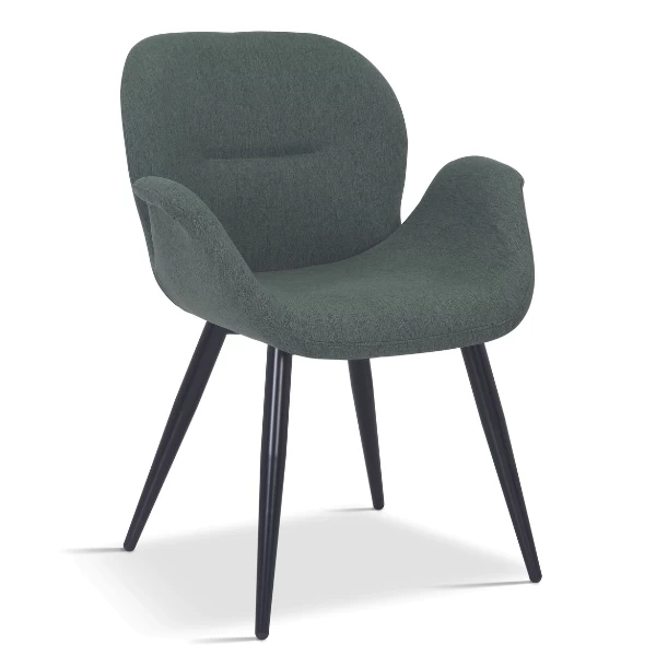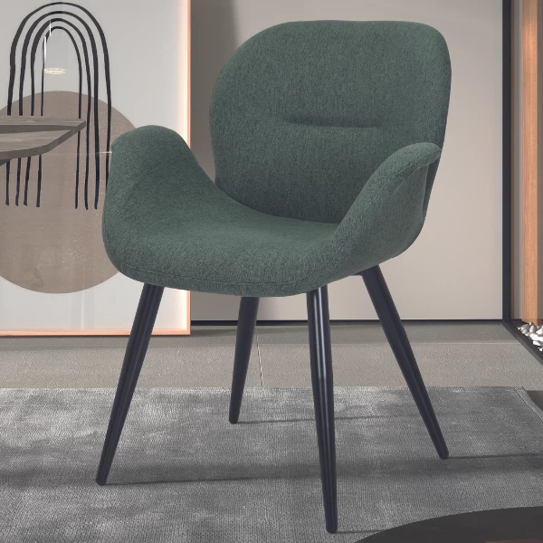 Eetkamerstoel Maxima heeft een groene polyester bekleding met zwarte metalen poten.Â