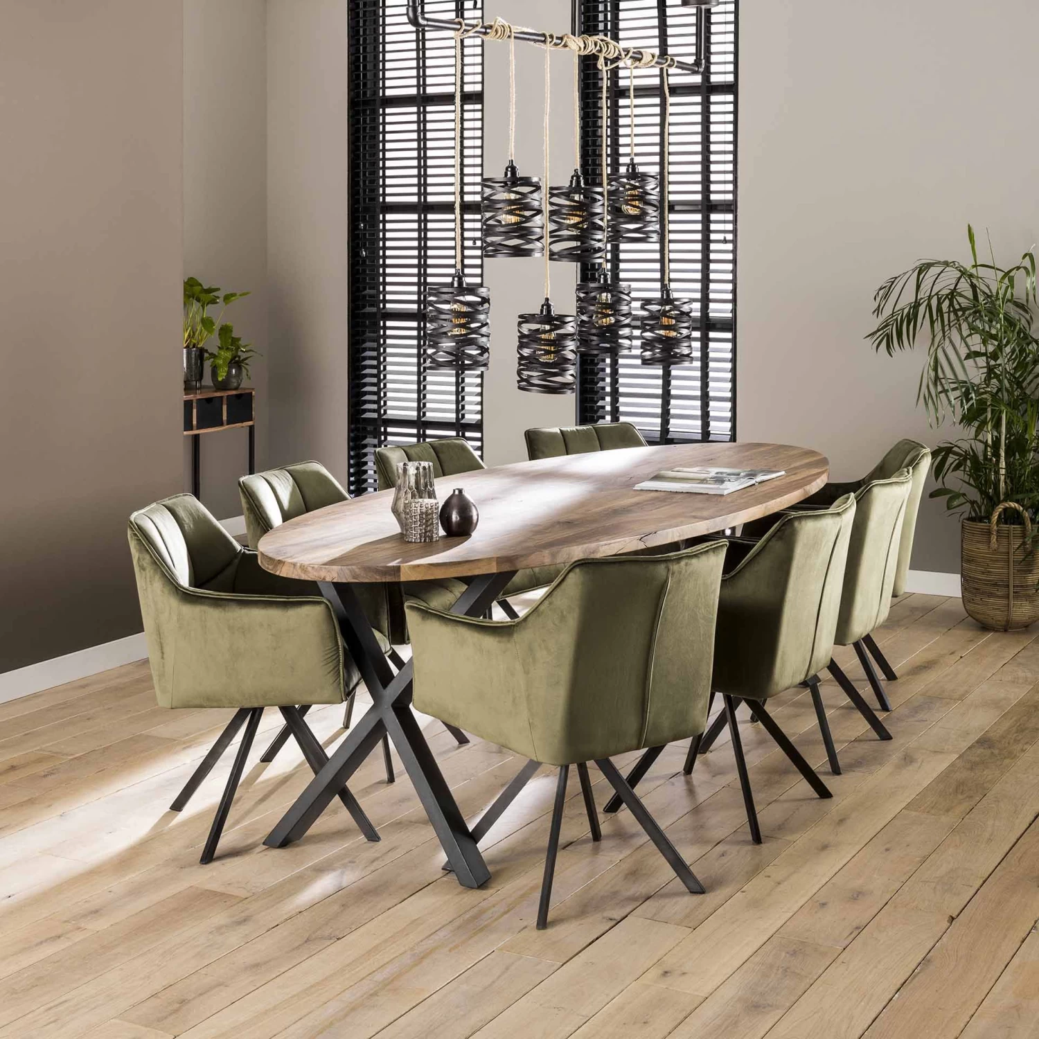 De stoelen van de Richi collectie zijn heel trendy dankzij hun bekleding in velvet. De stoelen bestaan in twee verschillende kleuren: roze en olijfgroen. Deze stoel bezit over een comfortabele zitting gemaakt uit polyurethaan en heeft de mogelijkheid om rond haar as te draaien.