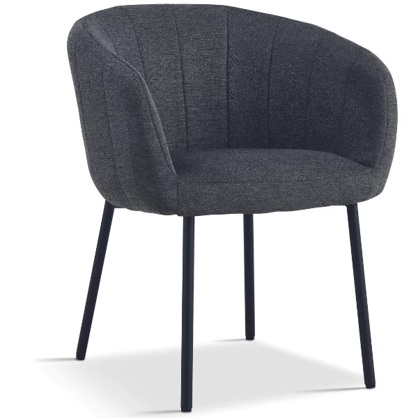 Eetkamerstoel Sill heeft een donkergrijze stoffen bekleding en zwarte metalen poten.