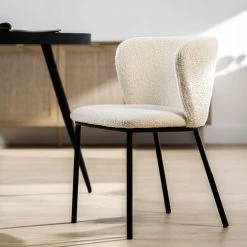 Eetkamerstoel Sinan in naturelkleurige teddystof, met poten uit zwart staal.